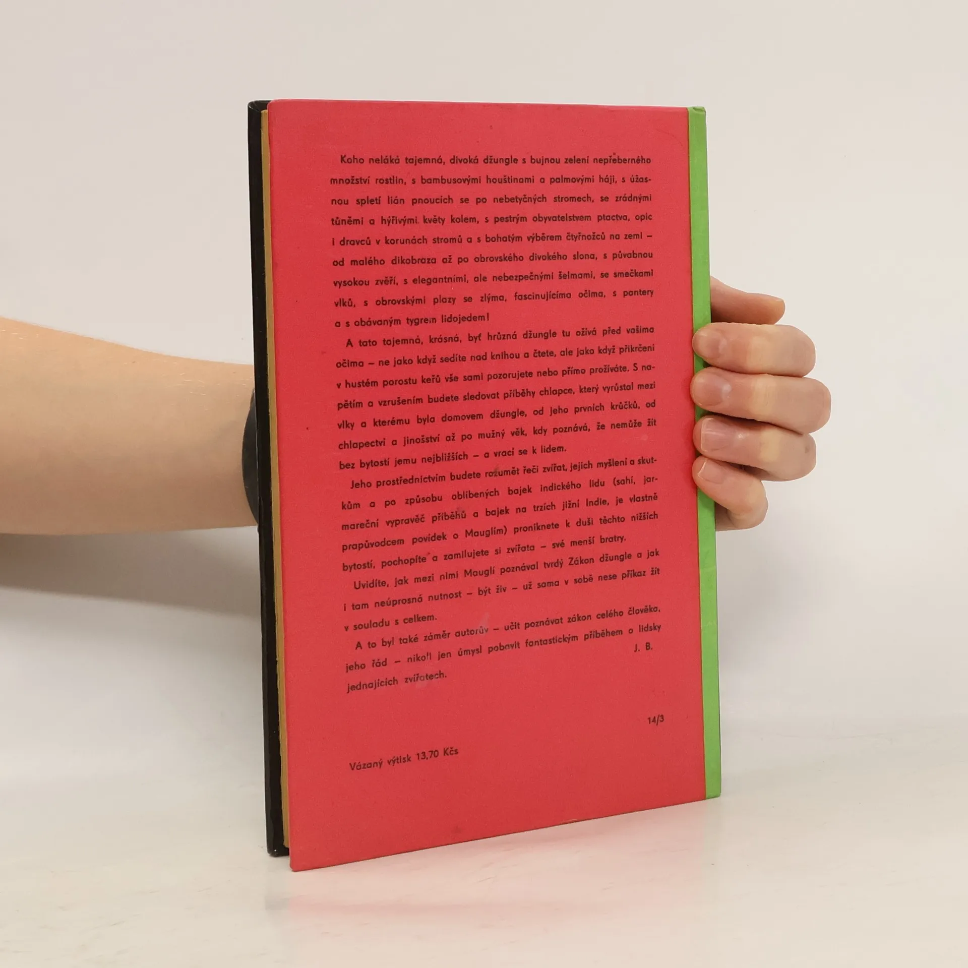 Povídky z džungle. Příběh Mauglího. Dejištěm povídek o Mauglím jsou překrásné, rozlehlé džungle v jižní části střední Indie-v provincii Madhjapradéš. Město Séóní leží při silnici, jež spojuje Džabalpur a Nágpur, zhruba uprostřed vzdálenosti mezi nimi. Séóníský okres je skorocelý pokryt hlubokými hustými lesy, kde žije ve velikých množstvích rozmanitá divoká zvěř. V těchto džunglích, které patří k nejkrásnějším v celé Indii, loví obyvatelstvo jednak zvěř, jednak se živí těžbou bambusu nebo tvrdého, načervenalého těkového dřeva, výborného na stavbu lodí. Séóníským okresem se vine horní tok řeky Vajngangy, jež dosahuje šíře až 270 m a jejíž celková délka od pramene po soutok s Gódávarou činí 560 km. Kapitoly: Mauglího bratři-Lovecká píseň séóníské smečky, Ká loví-Pochod Bandarů, Jak se zrodil Strach-Zákon džungle, "Tygr ! Tygr !-Mauglího píseň, Vpád džungle-Mauglího zpěv proti lidem, Králův ankus-Píseň malého lovce, Rezavý pes-Čílův zpěv, Jarní běh-Zpěv na rozloučenou. První vydání v SNDK. Cena knihy v čase vydání: 21,75 Kčs.