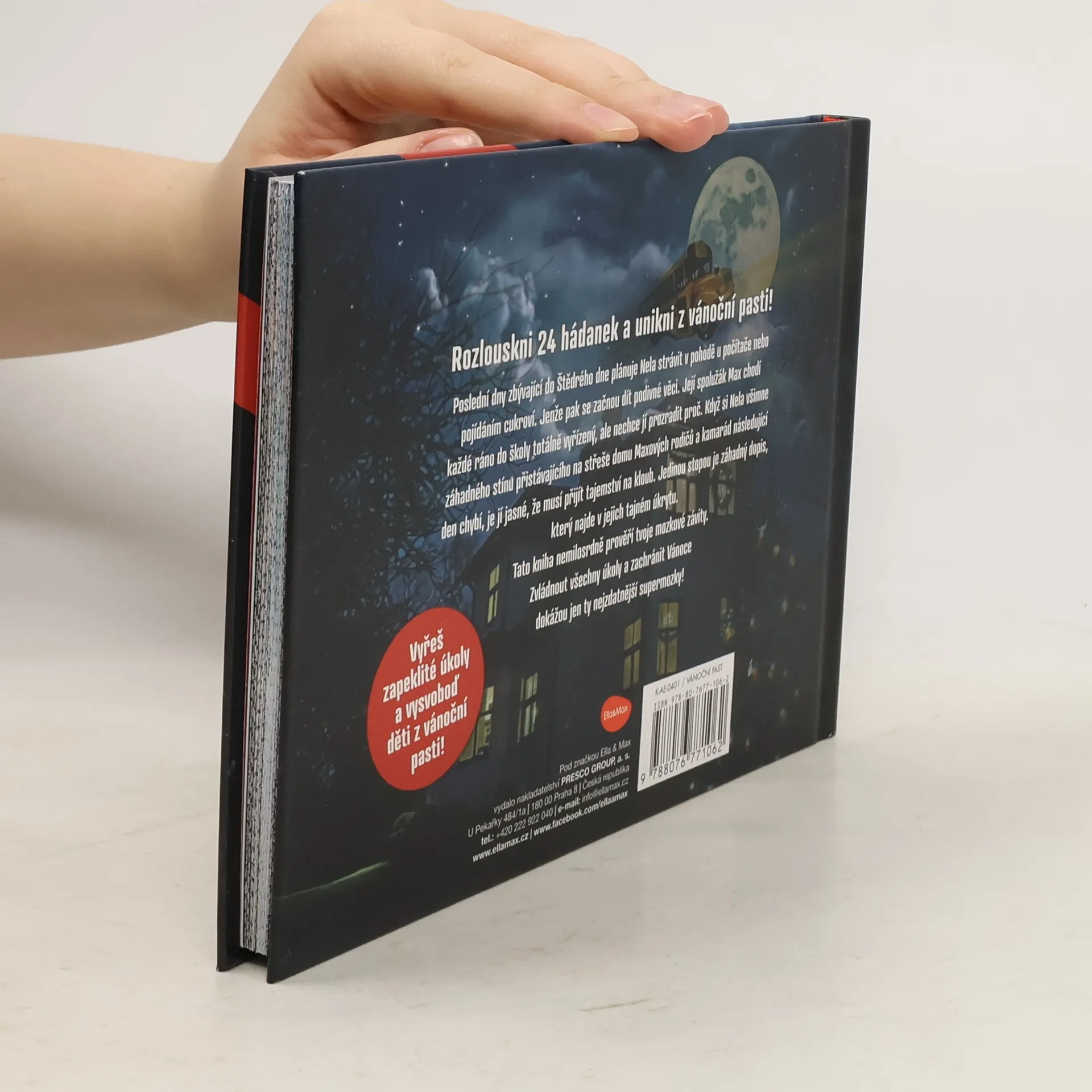 Poslední dny před Vánoci plánuje Nela strávit v pohodě u počítače nebo pojídáním cukroví. Jenže pak se začnou dít podivné věci. Její spolužák Max chodí do školy totálně vyřízený, ale nechce jí prozradit proč. Když si Nela všimne záhadného stínu přistávajícího na střeše Maxova domu a kamarád následující den chybí, je jí jasné, že to není jen tak. Máte dost odvahy a důvtipu? Jen když postupně vyluštíte všech 24 zapeklitých hádanek, dokážete osvobodit Maxe a další děti z vánoční pasti!