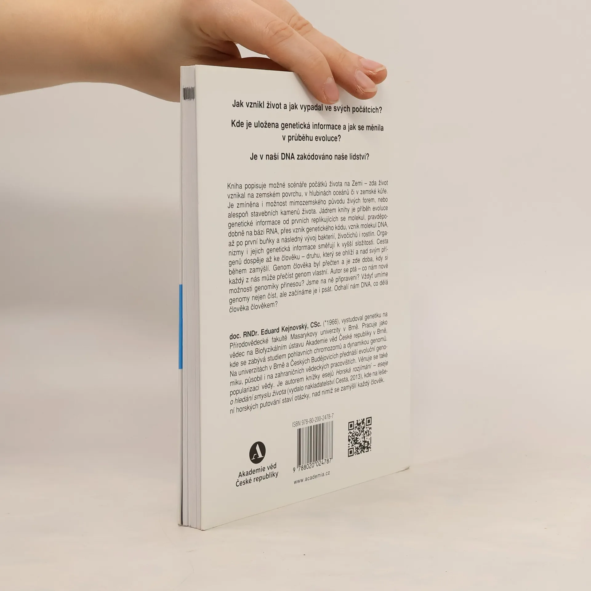 Vznikal život na zemském povrchu, v hlubinách oceánů či v zemské kůře? Je možný i mimozemský původ živých forem nebo alespoň stavebních kamenů života? Jádrem knihy je příběh evoluce genetické informace od prvních replikujících se molekul, pravděpodobně na bázi RNA, přes vznik genetického kódu, vznik molekul DNA, až po první buňky a následný vývoj bakterií, živočichů i rostlin. Organizmy i jejich genetická informace směřují k vyšší složitosti. Cesta genů dospěje až ke člověku – druhu, který se ohlíží a nad svým příběhem zamýšlí. Genom člověka byl přečten a je zde doba, kdy si každý z nás může přečíst genom vlastní. Co nám nové možnosti genomiky přinesou? Jsme na ně připraveni? Vždyť umíme genomy nejen číst, ale začínáme je i psát. Odhalí nám DNA, co dělá člověka člověkem?
