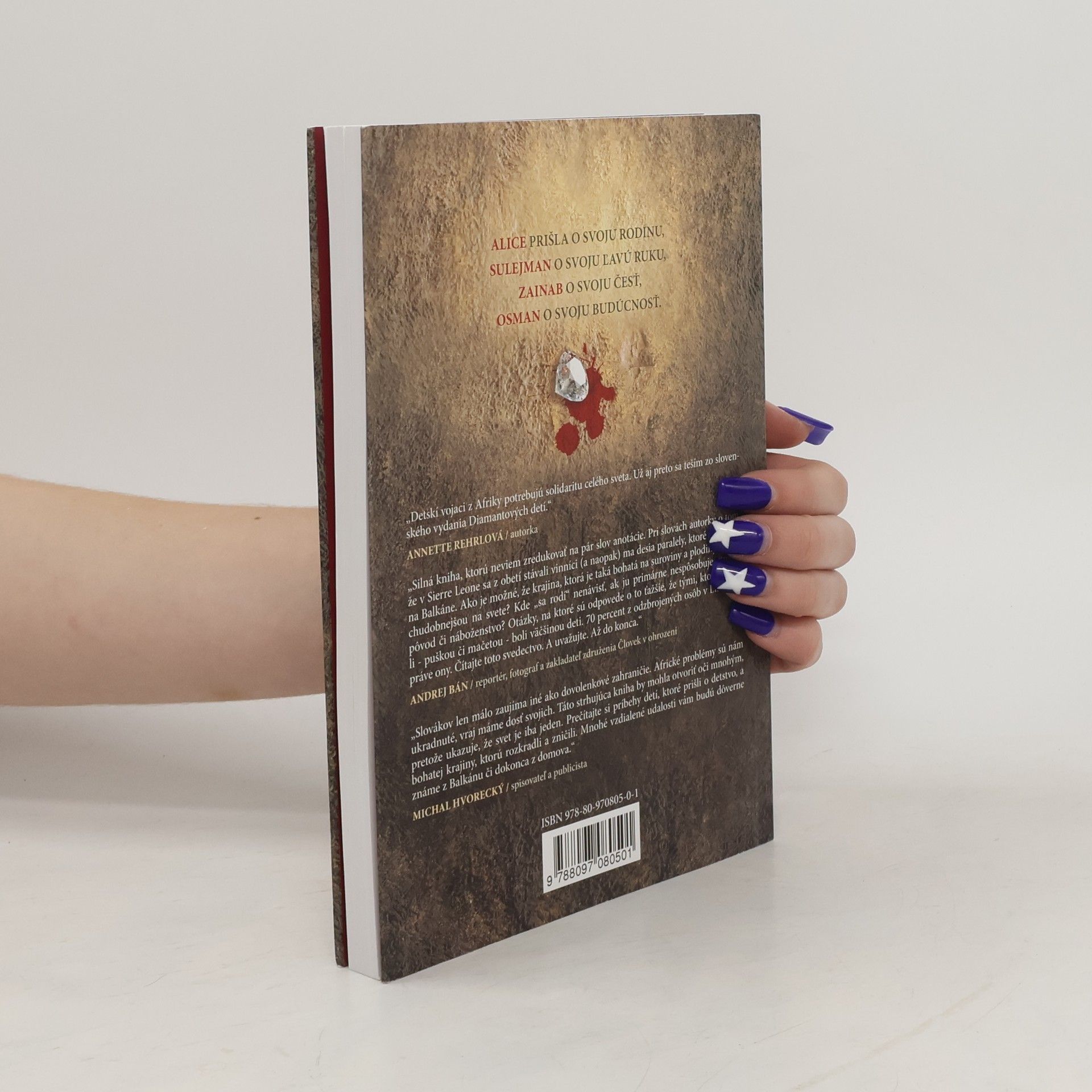 Kniha tlačovej hovorkyne Úradu Vysokého komisára OSN pre utečencov Annette Rehrlovej ponúka príbeh Sierry Leone, jednej z najchudobnejších krajín sveta, očami tých najkrehkejších - zástupcov tisícok detských vojakov. Detí, ktoré boli dennodenne konfrontované s násilím a brutalitou. Vnútorná sila, s akou sa s nimi vyrovnávali, posúva hranice pojmu nešťastie, tak ako ho chápeme my. Kniha Annette Rehrlovej Diamantové deti je výsledkom dvojmesačnej cesty autorky, ktorá sa uskutočnila z poverenia Úradu Vysokého komisára OSN pre utečencov v Ženeve, a prináša autentické svedectvá detí zo západoafrickej Sierry Leone postihnutej desaťročnou občianskou vojnou. Tieto deti stratili svoj domov, svojich príbuzných, boli unesené, zmrzačené, nútené bojovať, stali sa sexuálnymi otrokmi. Brutalita, s ktorou boli konfrontované, posúva hranice našich pojmov označujúcich ľudské utrpenie, no ich vnútorná sila nás zároveň presviedča aj o netušených možnostiach týchto krehkých a zraniteľných bytostí. Rehrlová prostredníctvom výpovedí detí načrtáva problémy chudoby, negramotnosti, korupcie, domáceho násilia, postavenia detí, žien, handikepovaných v spoločnosti, no najmä hrôzostrašný obraz takmer neodvrátiteľnej skazy celého národa, ktorý v týchto deťoch tak neuvážene ničil celú svoju budúcnosť.
