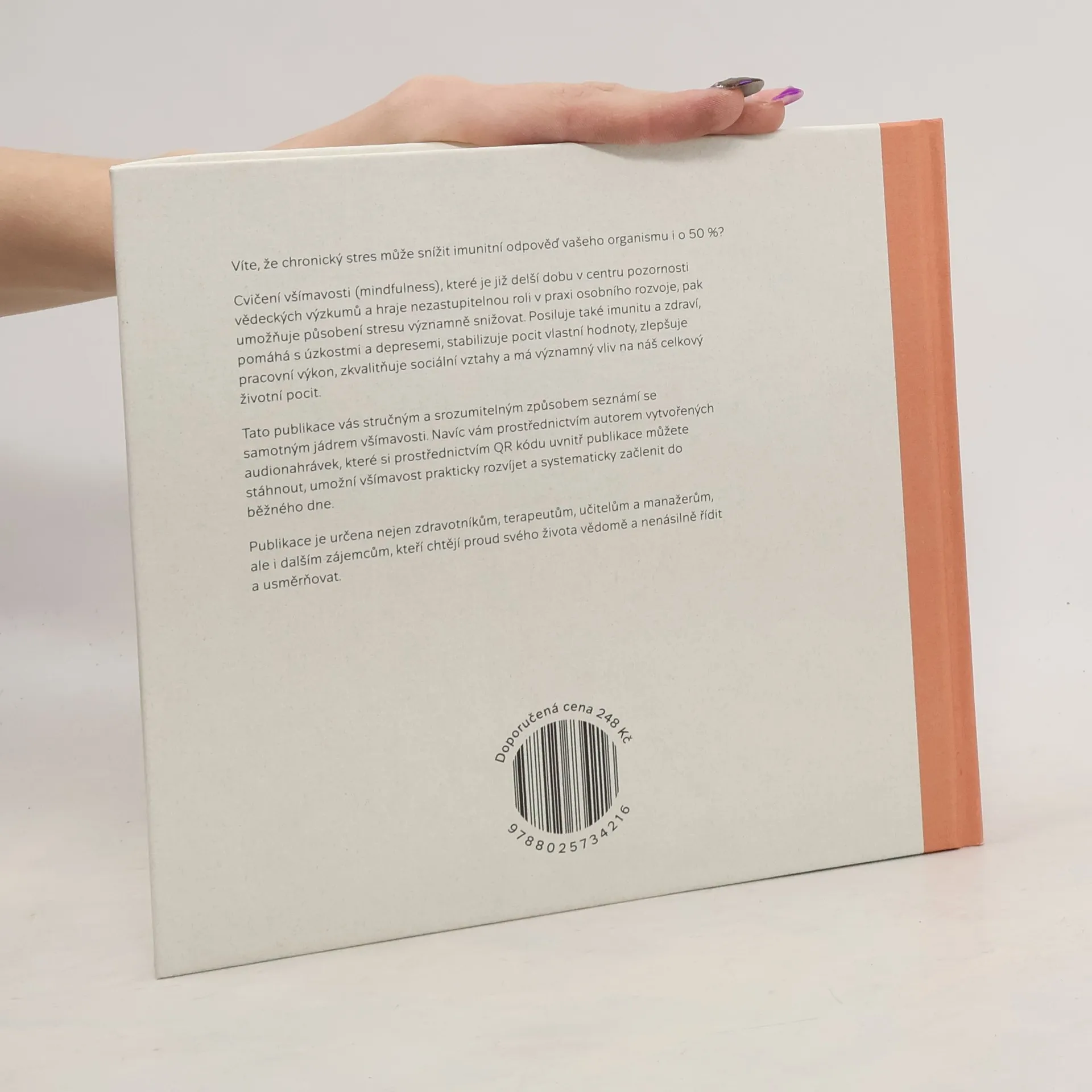 Cvičení všímavosti, které je již delší dobu v centru pozornosti vědeckých výzkumů a hraje nezastupitelnou roli v praxi osobního rozvoje, umožňuje významně snižovat působení stresu. Posiluje také imunitu a zdraví, pomáhá s úzkostmi a depresemi, stabilizuje pocit vlastní hodnoty, zlepšuje pracovní výkon, zkvalitňuje sociální vztahy a má významný vliv na náš celkový životní pocit. Tato inspirativní publikace, která zasazuje téma všímavosti do širších souvislostí, zároveň nabízí praktický způsob, jak na základě autorem vytvořených audionahrávek všímavost rozvíjet a začlenit do běžného dne. Je určena nejen zdravotníkům, terapeutům, učitelům a manažerům, ale i dalším zájemcům, kteří chtějí proud svého života vědomě a nenásilně kultivovat a usměrňovat.