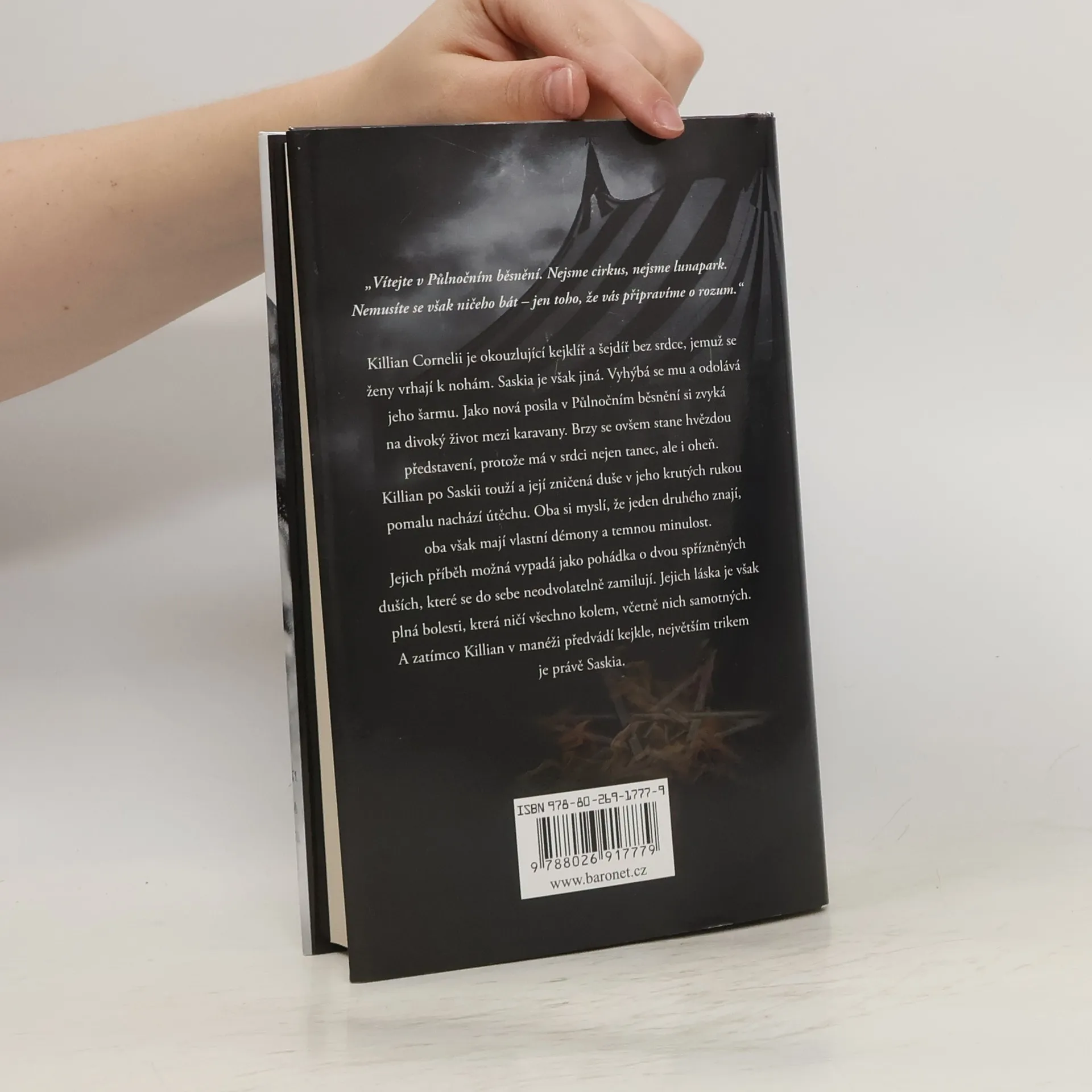 „Vítejte v Půlnočním běsnění. Nejsme cirkus, nejsme lunapark. Nemusíte se však ničeho bát – jen toho, že vás připravíme o rozum.“ Killian Cornelii je okouzlující kejklíř a šejdíř bez srdce, jemuž se ženy vrhají k nohám. Saskia je však jiná. Vyhýbá se mu a odolává jeho šarmu. Jako nová posila v Půlnočním běsnění si zvyká na divoký život mezi karavany. Brzy se ovšem stane hvězdou představení, protože má v srdci nejen tanec, ale i oheň. Killian po Saskii touží a její zničená duše v jeho krutých rukou pomalu nachází útěchu. Oba si myslí, že jeden druhého znají, oba však mají vlastní démony a temnou minulost. Jejich příběh možná vypadá jako pohádka o dvou spřízněných duších, které se do sebe neodvolatelně zamilují. Jejich láska je však plná bolesti, která ničí všechno kolem, včetně nich samotných. A zatímco Killian v manéži předvádí kejkle, největším trikem je právě Saskia.