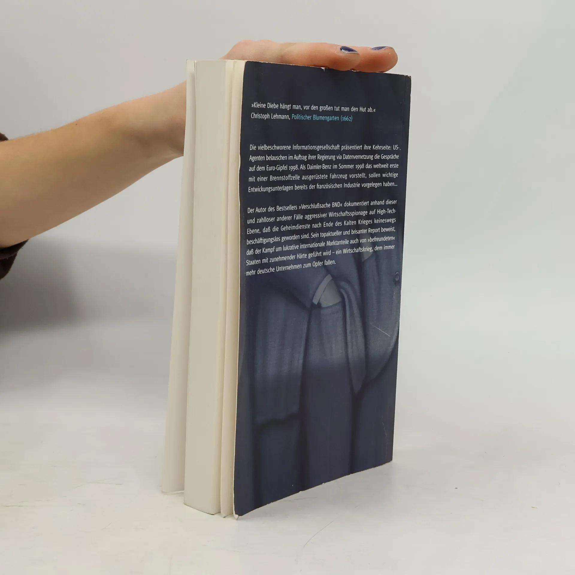 Jahr für Jahr werden zehntausende Arbeitsplätze in Deutschland durch Wirtschaftsspionage vernichtet. Globalisierung und Konkurrenzdruck heizen den Handel mit Firmendaten an. Der Autor stellt fest, dass es keine Information gibt, die man nicht kaufen kann. Während ausländische Regierungen ihren Unternehmen die Hilfe der Geheimdienste sicherten, würde sich die deutsche Regierung taubstellen, so Ulfkotte. Dabei seien die Schäden in deutschen Unternehmen unübersehbar.