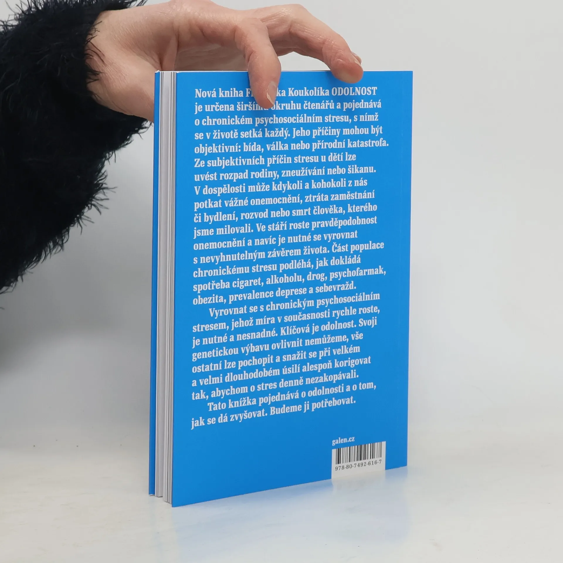 Nová kniha Františka Koukolíka Odolnost je určena širšímu okruhu čtenářů a pojednává o chronickém psychosociálním stresu, s nímž se v životě setká každý. Jeho příčiny mohou být objektivní: bída, válka nebo přírodní katastrofa. Ze subjektivních příčin stresu u dětí lze uvést rozpad rodiny, zneužívání nebo šikanu. V dospělosti může kdykoli a kohokoli z nás potkat vážné onemocnění, ztráta zaměstnání či bydlení, rozvod nebo smrt člověka, kterého jsme milovali. Ve stáří roste pravděpodobnost onemocnění a navíc je nutné se vyrovnat s nevyhnutelným závěrem života. Část populace chronickému stresu podléhá, jak dokládá spotřeba cigaret, alkoholu, drog, psychofarmak, obezita, prevalence deprese a sebevražd. Vyrovnat se s chronickým psychosociálním stresem, jehož míra v současnosti rychle roste, je nutné a nesnadné. Klíčová je odolnost. Svoji genetickou výbavu ovlivnit nemůžeme, vše ostatní lze pochopit a snažit se při velkém a velmi dlouhodobém úsilí alespoň korigovat tak, abychom o stres denně nezakopávali. Tato knížka pojednává o odolnosti a o tom, jak se dá zvyšovat. Budeme ji potřebovat.