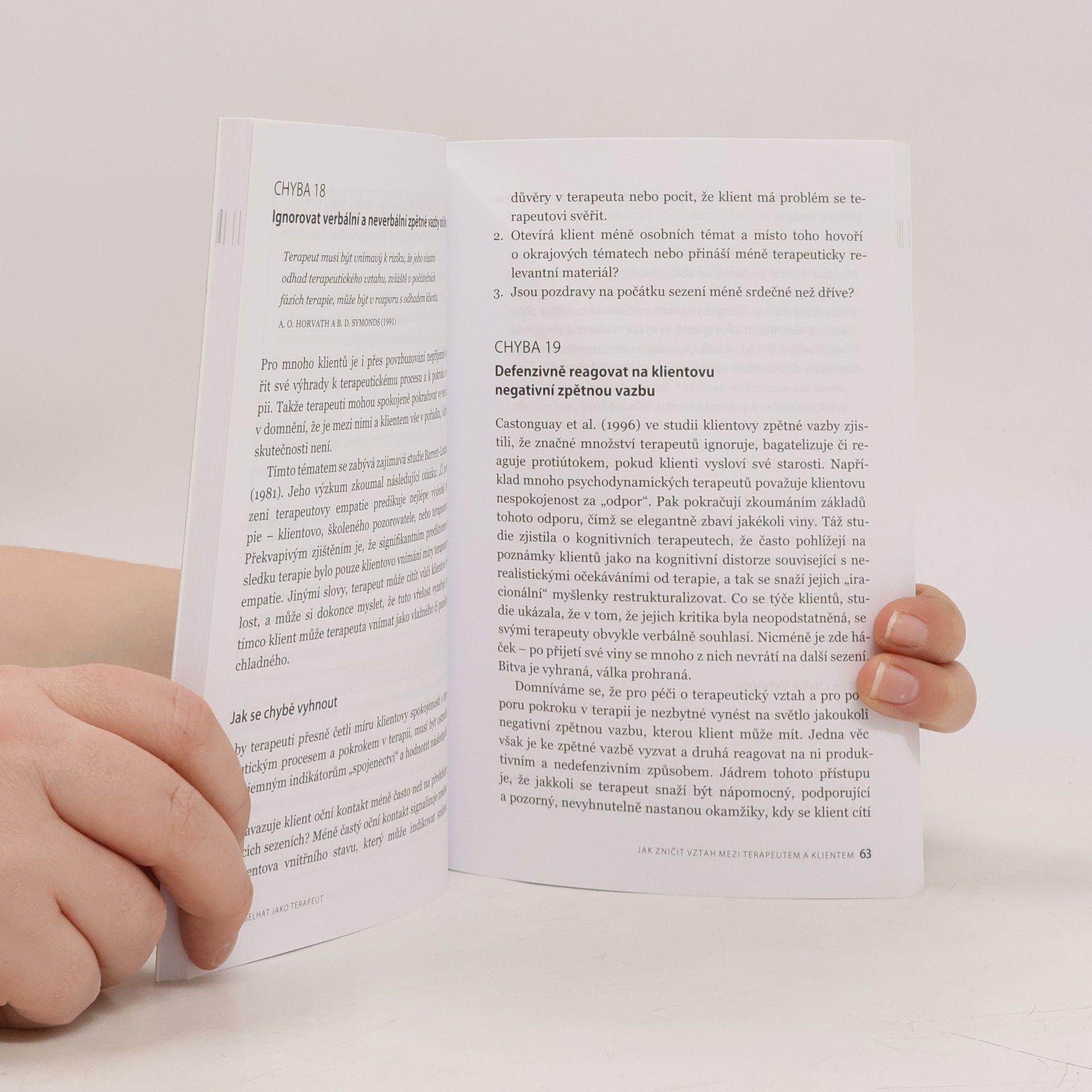Kniha představuje 50 nejběžnějších, výzkumem podložených chyb, kterých se psychoterapeuti ve své praxi dopouštějí. Nespokojenost s terapeutem je častým důvodem pro předčasné ukončení terapie. Navíc většina terapeutů nemá představu, proč jejich klienti odešli. Dobrou zprávou ale je, že dnes již existuje řada prozkoumaných strategií, které míru předčasného ukončení terapie snižují. Mezi nejčastější chyby patří: neznat vlastní limity, ignorovat vědu, poškozovat terapeutický vztah, nepečovat o hranice, dopouštět se špatného časování, nepředcházet vlastnímu vyhoření a mnoho dalších. Kromě jejich popisu autoři zároveň nabízejí k úvaze, jak se jich vyvarovat. Jde o užitečný text především pro psychoterapeuty v praxi a studenty v terapeutickém výcviku, knihu ale využijí také psychologové a pracovníci v pomáhajících profesí.