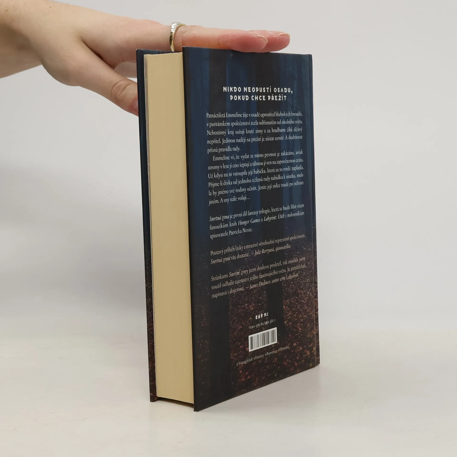 Nikdo neopustí osadu, pokud chce přežít. V imaginárním světě připomínajícím středověk žije v osadě uprostřed tajemných lesů patnáctiletá Emmeline. Puritánská komunita dodržuje přísná pravidla, která mají ochránit její členy před nebezpečím pocházejícím z okolních hvozdů. Emmeline ví, že vydat se mimo osadu je přísně zakázané, avšak stromy v lese jí cosi šeptají a táhnou ji na zapovězenou cestu. Když zůstane tady, čeká ji manželství, o které nestojí, a život vedle kluka, jehož nemůže mít. Ale venku? Malmaci číhá a zima se blíží... Smrtná zima je první díl ohromující nové young adult série, která se bude líbit všem fanouškům knih Hunger Games a Labyrint: Útěk i milovníkům spisovatele Patricka Nesse.