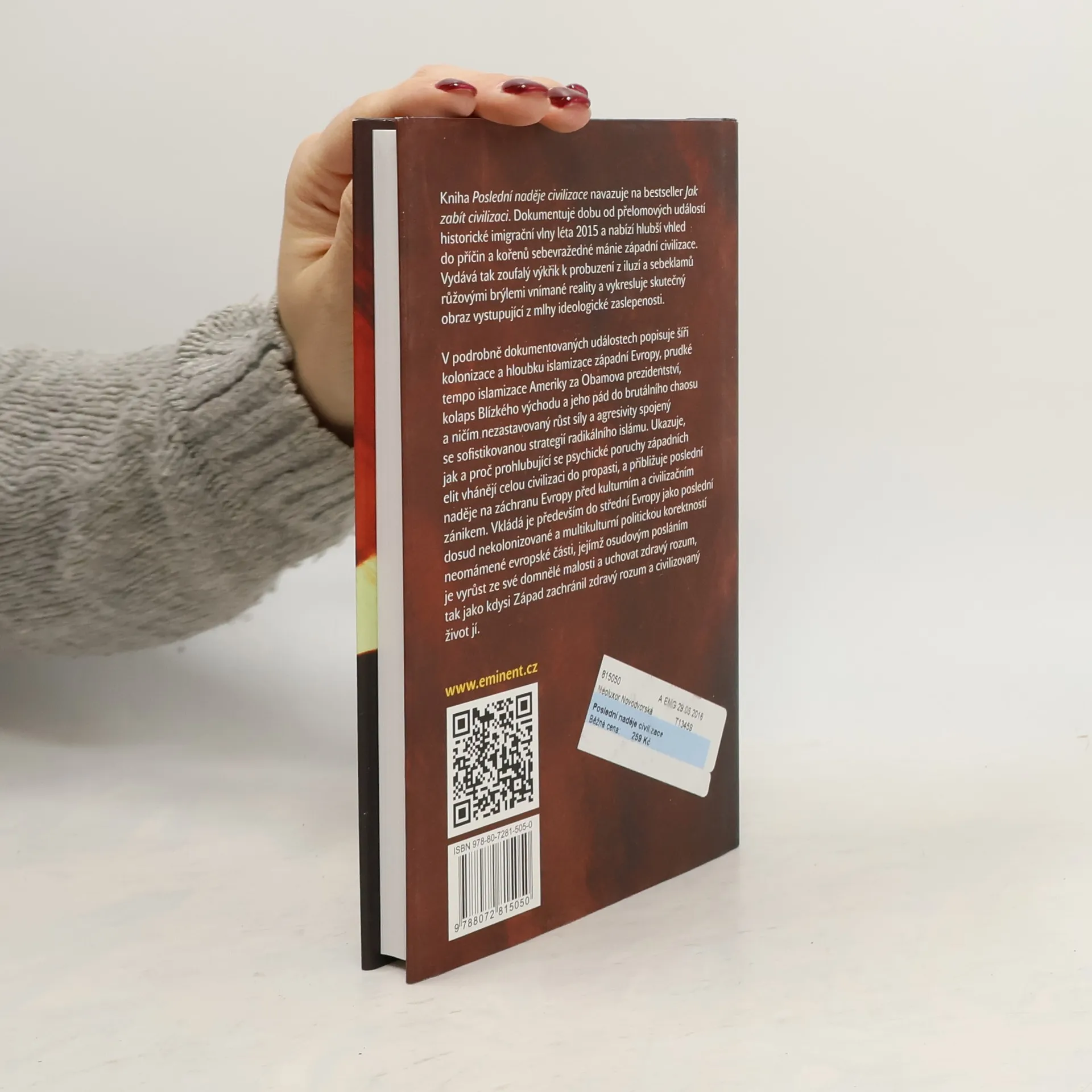 Kniha Poslední naděje civilizace navazuje na bestseller Jak zabit civilizaci. Dokumentuje dobu od přelomových událostí historické imigrační vlny léta 2015 a nabízí hlubší vhled do příčin a kořenů sebevražedné mánie západní civilizace. Vydává tak zoufalý výkřik k probuzeni z iluzí a sebeklamů růžovými brýlemi vnímané reality a vykresluje skutečný obraz vystupující z mlhy ideologické zaslepenosti. V podrobně dokumentovaných událostech popisuje šíři kolonizace a hloubku islamizace západní Evropy, prudké tempo islamizace Ameriky za Obamova prezidentství, kolaps Blízkého východu a jeho pád do brutálního chaosu a ničím nezastavovaný růst síly a agresivity spojený se sofistikovanou strategií radikálního islámu. Ukazuje, jak a proč prohlubující se psychické poruchy západních elit vhánějí celou civilizaci do propasti, a přibližuje poslední naděje na záchranu Evropy před kulturním a civilizačním zánikem. Vkládá je především do střední Evropy jako poslední dosud nekolonizované a multikulturní politickou korektností neomámené evropské části, jejímž osudovým posláním je vyrůst ze své domnělé malosti a uchovat zdravý rozum, tak jako kdysi Západ zachránil zdravý rozum a civilizovaný život jí.