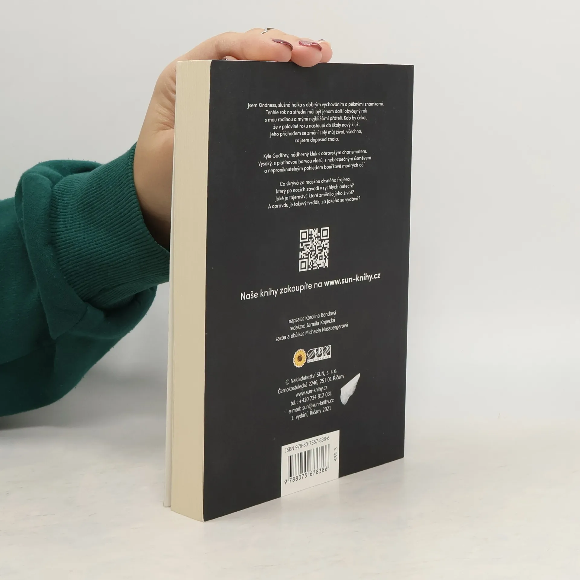 Jsem Kindness, slušná holka s dobrým vychováním a pěknými známkami. Tenhle rok na střední měl být jenom další obyčejný rok s mou rodinou a mými nejbližšími přáteli. Kdo by čekal, že v polovině roku nastoupí do školy nový kluk. Jeho příchodem se změní celý můj život, všechno co jsem doposud znala. Kyle Godfrey, nádherný kluk a obrovským charismatem. Vysoký, s platinovou barvou vlasů, s nebezpečným úsměvem a neproniknutelným pohledem bouřkově modrých očí. Co skrývá za maskou drsného frajera, který po nocí závodí v rychlých autech? Jaké je tajemství, které změnilo jeho život? A opravdu je takový tvrďák za jakého se vydává? Tohle bude holky bavit, zvlášť když to napsala jedna z nich, Karolína Bendová, která původně publikovala na amatérské sociální síti Wattpad pod pseudonymem Sweerty.