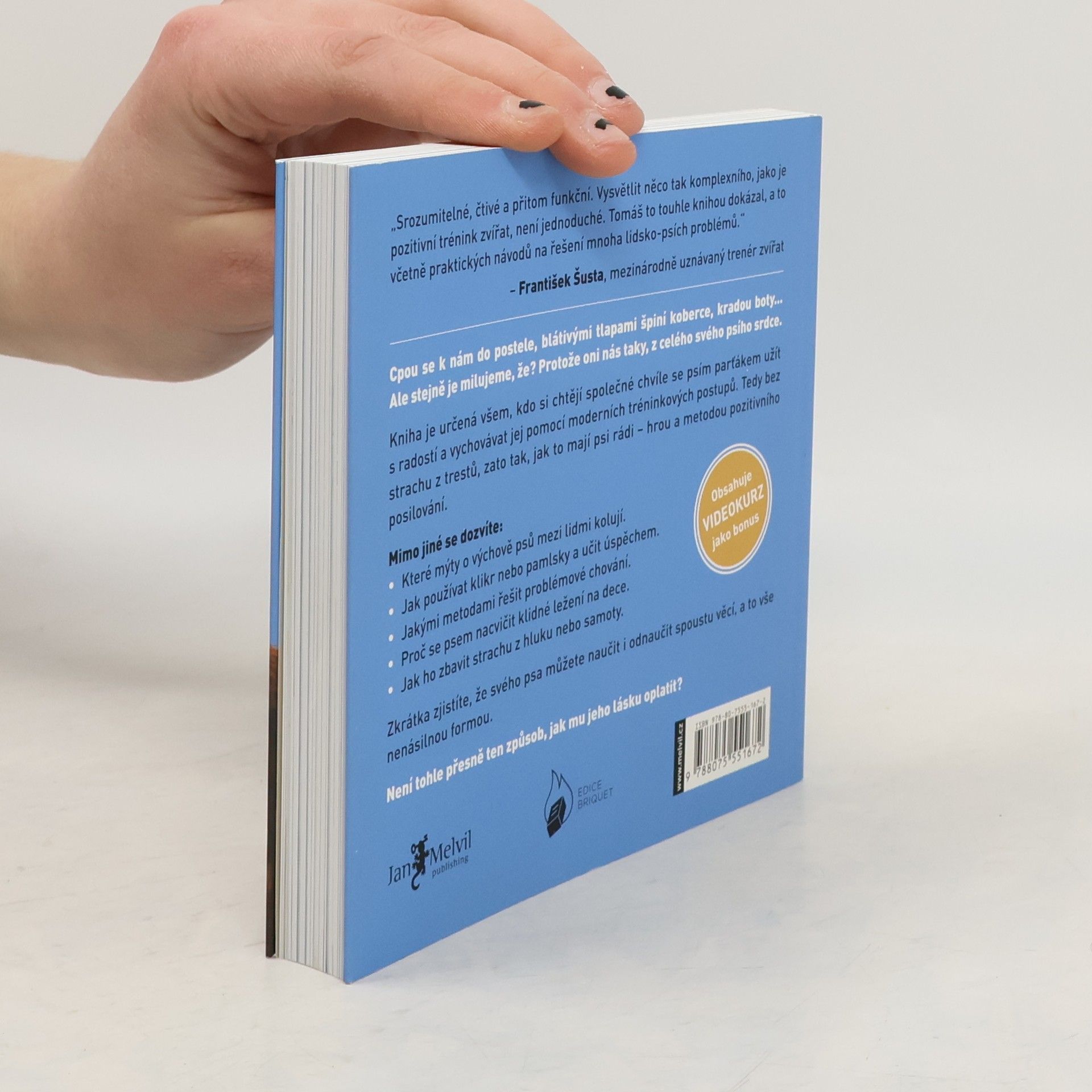 Manuál láskyplné a efektivní výchovy.Cpou se k nám do postele, blátivými tlapami špiní koberce, kradou boty… Ale stejně je milujeme, že? Protože oni nás taky, z celého svého psího srdce. Kniha je určena všm, kdo si chtějí společné chvíle se psím parťákem užít s radostí a vychovávat jej pomocí moderních tréninkových postupů. Tedy bez strachu z trestů, zato tak, jak to mají psi rádi – hrou a metodou pozitivního posilování. Mimo jiné se dozvíte: které mýty o výchově psů mezi lidmi kolují, jak používat klikr nebo pamlsky a učit úspěchem, jakými metodami řešit problémové chování, proč se psem nacvičit klidné ležení na dece a jak ho zbavit strachu z hluku nebo samoty. Zkrátka zjistíte, že svého psa můžete naučit i odnaučit spoustu věcí, a to vše nenásilnou formou. Není tohle přesně ten způsob, jak mu jeho lásku oplatit?