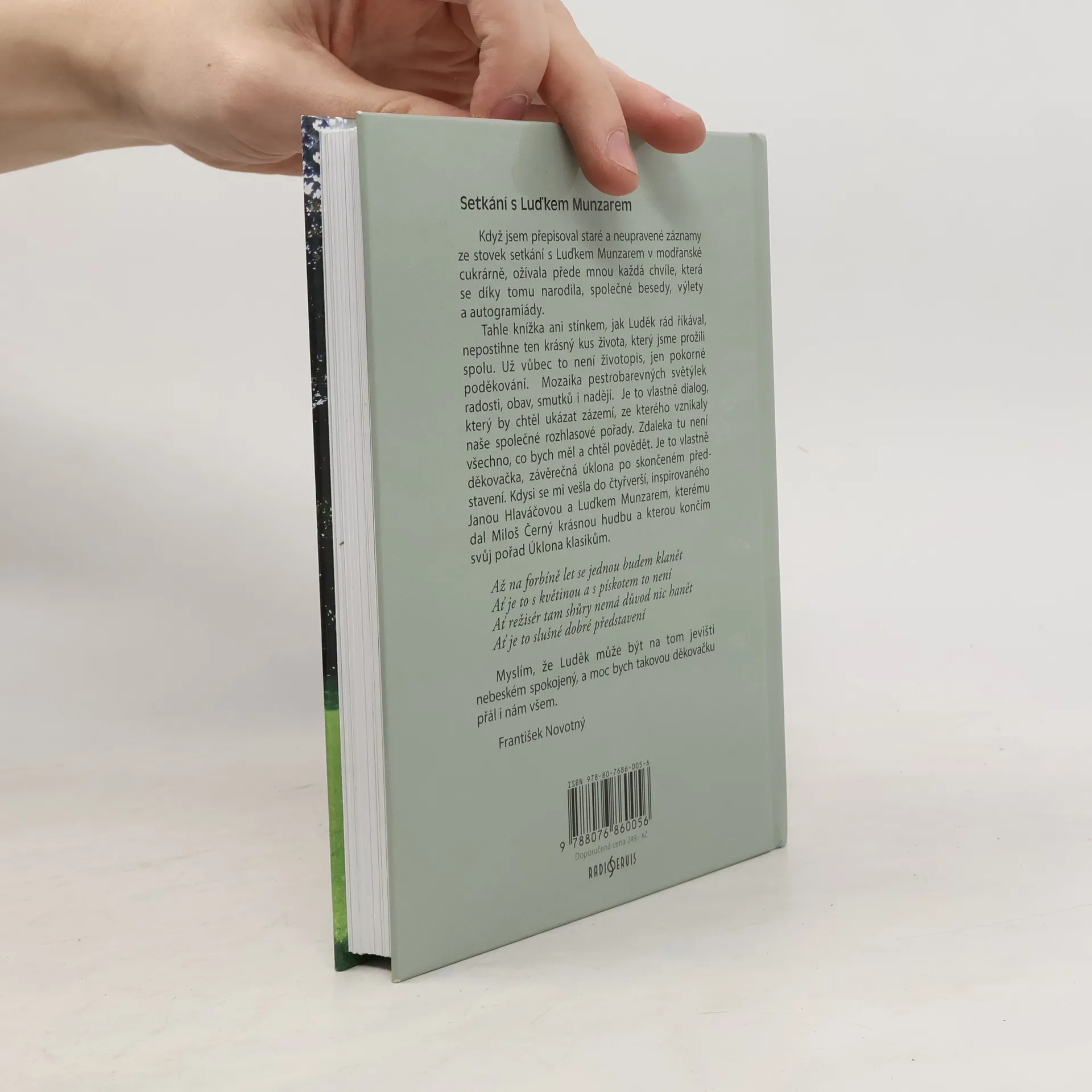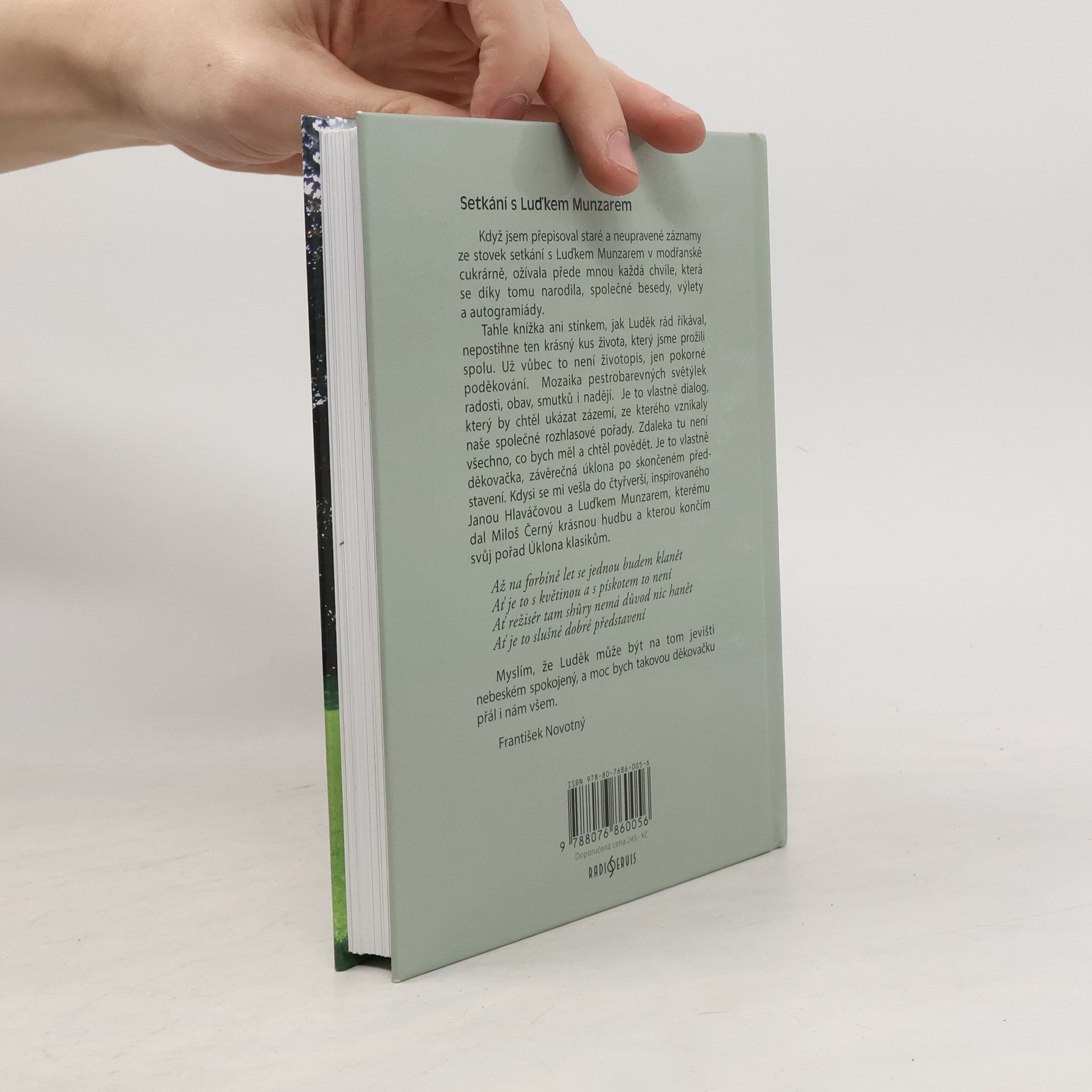 Kniha setkávání autora Františka Novotného s dlouholetým partnerem u rozhlasového mikrofonu hercem Luďkem Munzarem v modřanské cukrárně, kde se rodily stovky dílů pořadů Okouzlení slovem a Setkání s Karlem Čapkem. Nad kávou a zákusky probírali nejrůznější témata, z nichž vznikaly společné rozhlasové pořady. Je to též ohlédnutí za krásným přátelstvím těchto dvou výjimečných lidí.