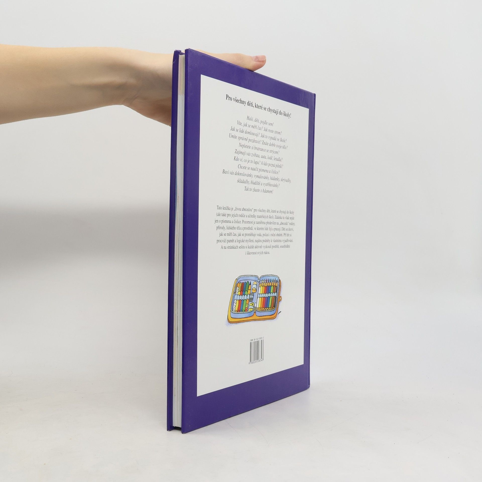 Tato knížka je "živou abecedou" pro všechny děti, které se chystají do školy (ale také pro jejich rodiče a učitelky mateřských škol). Zdaleka tu však nejde jen o písmena a číslice. Pozornost je zaměřena především na "abecedu" rodiny, přírody, lidského těla a prostředí, ve kterém lidé žijí a pracují. Děti se dozví, jak se měří čas, jak se proměňuje voda, počasí i roční období. Při hře si procvičí pamět a logické myšlení, najdou podněty k vlastnímu vyjadřování. A na stránkách sešitu si každé aktivně vyzkouší postřeh, soustředění i šikovnost svých rukou.
