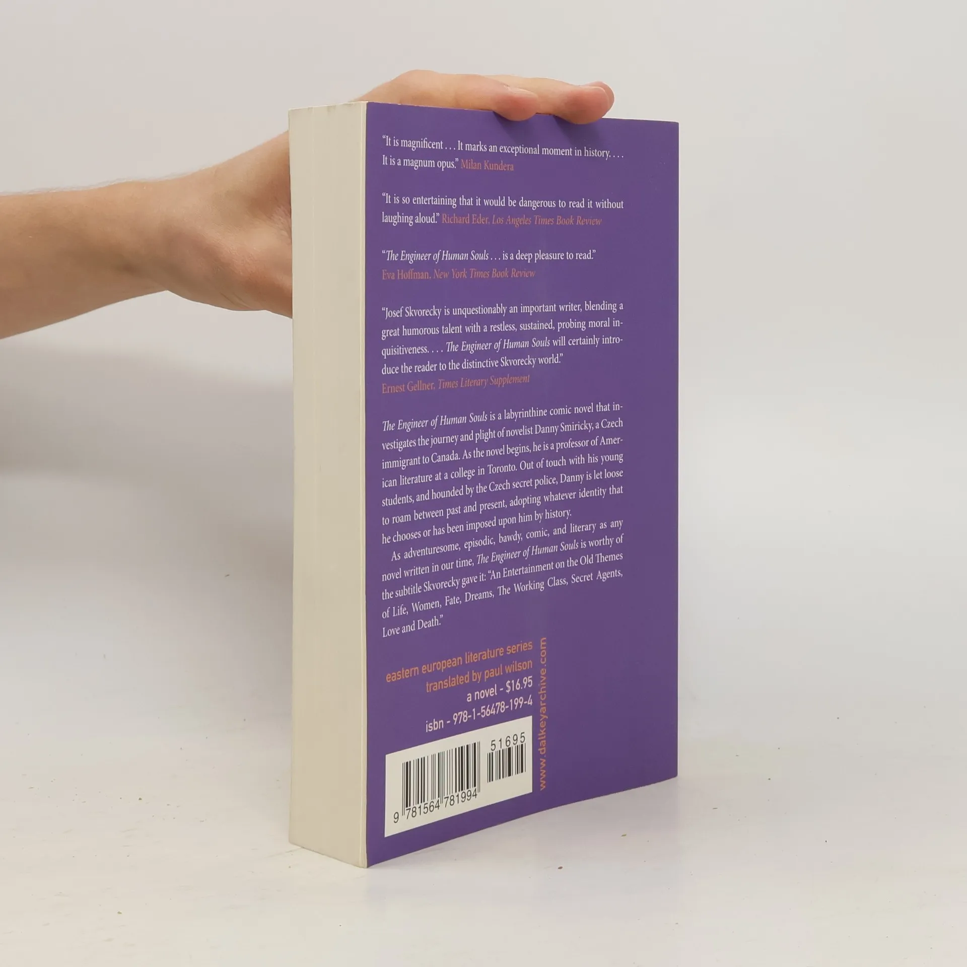 The Engineer of Human Souls is a labyrinthine comic novel that investigates the journey and plight of novelist Danny Smiricky, a Czech immigrant to Canada. As the novel begins, he is a professor of American literature at a college in Toronto. Out of touch with his young students, and hounded by the Czech secret police, Danny is let loose to roam between past and present, adopting whatever identity that he chooses or has been imposed upon him by History.