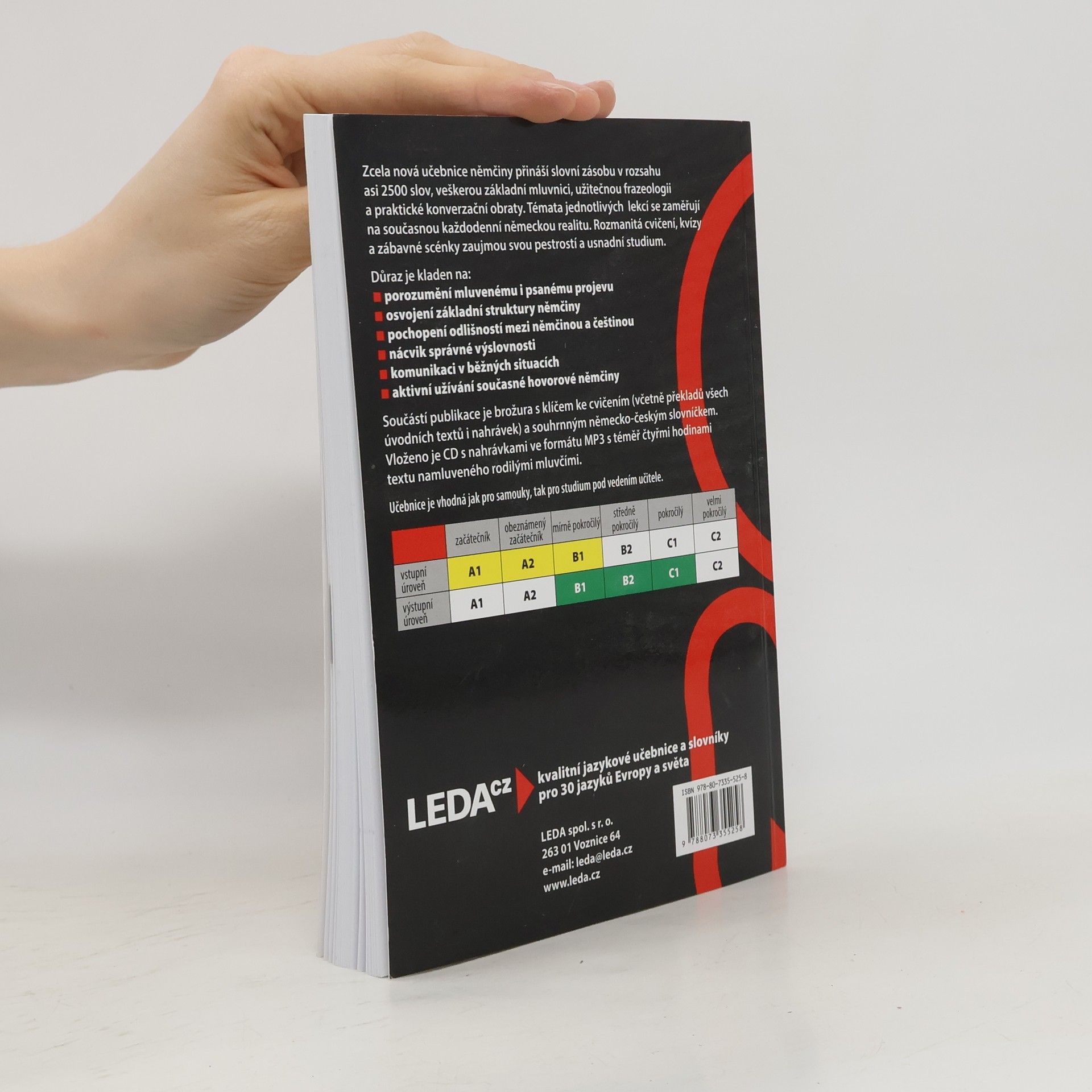 Učebnice němčiny vhodná pro samostudium je doplněna klíčem ke cvičením, německo-českým slovníkem a CD-MP3.Učebnice určená začátečníkům obsahuje celkem 25 lekcí s úvodním článkem, přehledem slovní zásoby, výkladem gramatiky a cvičeními.