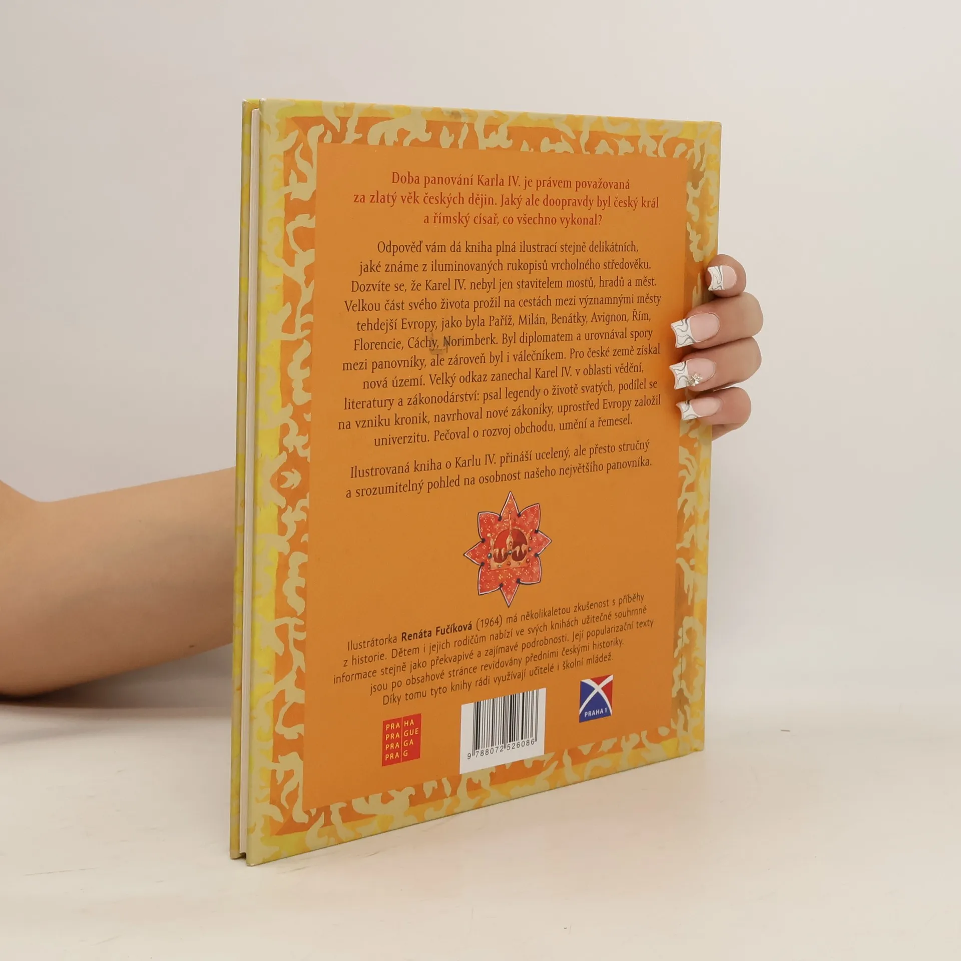 Doba panování Karla IV. je právem považovaná za zlatý věk českých dějin. Jaký ale doopravdy byl český král a římský císař, co všechno vykonal? Odpověď vám dá kniha plná ilustrací stejně delikátních, jaké známe z iluminovaných rukopisů vrcholného středověku. Dozvíte se, že Karel IV. byl nejen stavitelem mostů, hradů a měst. Velkou část svého života prožil na cestách mezi významnými městy tehdejší Evropy, jako byla Paříž, Milano, Benátky, Avignon, Řím, Florencie, Cáchy, Norimberk. Byl diplomatem a urovnával spory mezi panovníky, ale zároveň byl i válečníkem. Pro české země získal nová území. Velký odkaz zanechal Karel IV. v oblasti vědění, literatury a zákona. Sepsal legendy o životě nejstarších Přemyslovců, podílel se na vzniku kronik, sestavil nový zákoník, uprostřed Evropy založil univerzitu. Pečoval o rozvoj obchodu, umění a řemesel. Ilustrovaná kniha o Karlu IV. nabízí ucelený, ale přesto stručný a srozumitelný pohled na osobnost našeho největšího panovníka. Renáta Fučíková je přední česká ilustrátorka a autorka zejména populárně vzdělávacích knih pro děti o české historii. Za svou tvorbu dostala řadu ocenění včetně Zlaté stuhy a nominaci na Magnesii literu.