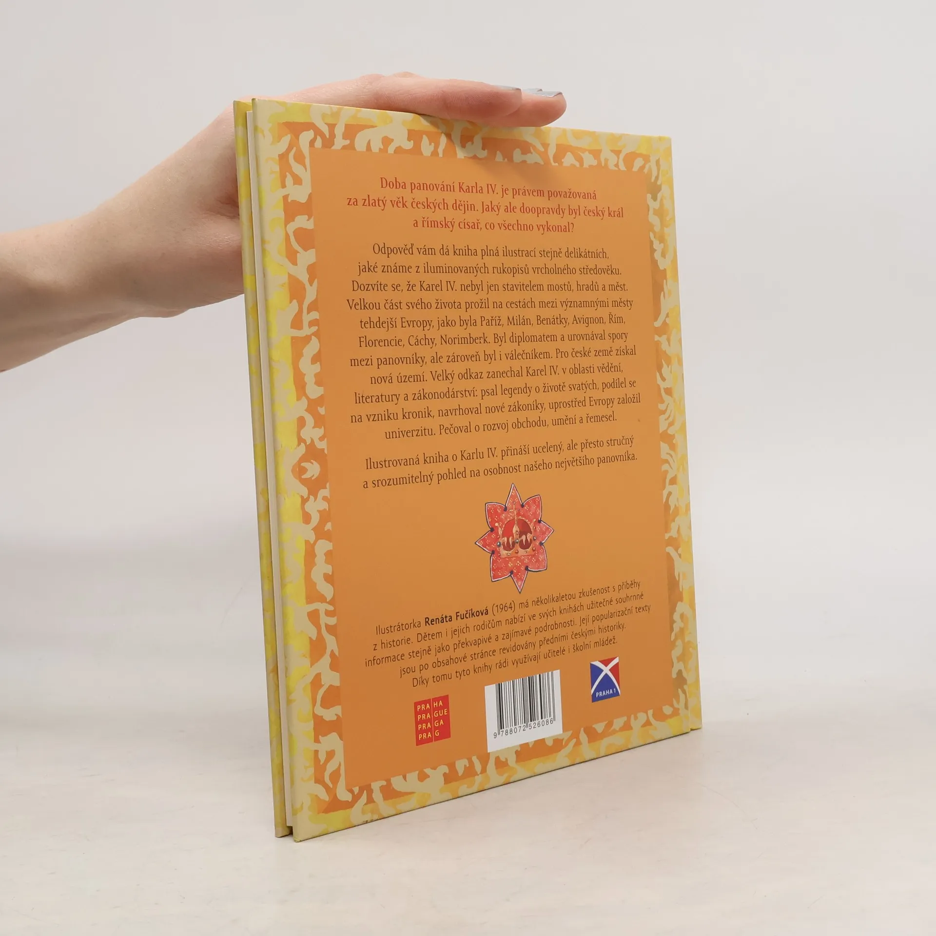 Doba panování Karla IV. je právem považovaná za zlatý věk českých dějin. Jaký ale doopravdy byl český král a římský císař, co všechno vykonal? Odpověď vám dá kniha plná ilustrací stejně delikátních, jaké známe z iluminovaných rukopisů vrcholného středověku. Dozvíte se, že Karel IV. byl nejen stavitelem mostů, hradů a měst. Velkou část svého života prožil na cestách mezi významnými městy tehdejší Evropy, jako byla Paříž, Milano, Benátky, Avignon, Řím, Florencie, Cáchy, Norimberk. Byl diplomatem a urovnával spory mezi panovníky, ale zároveň byl i válečníkem. Pro české země získal nová území. Velký odkaz zanechal Karel IV. v oblasti vědění, literatury a zákona. Sepsal legendy o životě nejstarších Přemyslovců, podílel se na vzniku kronik, sestavil nový zákoník, uprostřed Evropy založil univerzitu. Pečoval o rozvoj obchodu, umění a řemesel. Ilustrovaná kniha o Karlu IV. nabízí ucelený, ale přesto stručný a srozumitelný pohled na osobnost našeho největšího panovníka. Renáta Fučíková je přední česká ilustrátorka a autorka zejména populárně vzdělávacích knih pro děti o české historii. Za svou tvorbu dostala řadu ocenění včetně Zlaté stuhy a nominaci na Magnesii literu.
