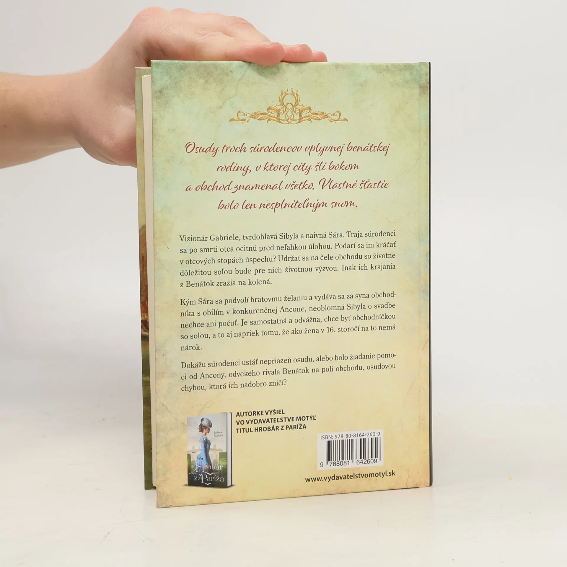 Osudy troch súrodencov vplyvnej benátskej rodiny, v ktorej city šli bokom a obchod znamenal všetko. Vlastné šťastie bolo len nesplniteľným snom. Vizionár Gabriele, tvrdohlavá Sibyla a naivná Sára. Traja súrodenci sa po smrti otca ocitnú pred neľahkou úlohou. Podarí sa im kráčať v otcových stopách úspechu? Udržať sa na čele obchodu so životne dôležitou soľou bude pre nich životnou výzvou. Inak ich krajania z Benátok zrazia na kolená. Kým Sára sa podvolí bratovmu želaniu a vydáva sa za syna obchodníka s obilím v konkurenčnej Ancone, neoblomná Sibyla o svadbe nechce ani počuť. Samostatná a odvážna chce byť obchodníčkou so soľou, aj napriek tomu, že ako žena v 16. storočí na to nemá nárok. Dokážu súrodenci ustáť nepriazeň osudu alebo bolo žiadanie pomoci od Ancony, odvekého rivala Benátok na poli obchodu, osudovou chybou, ktorá ich nadobro zničí?