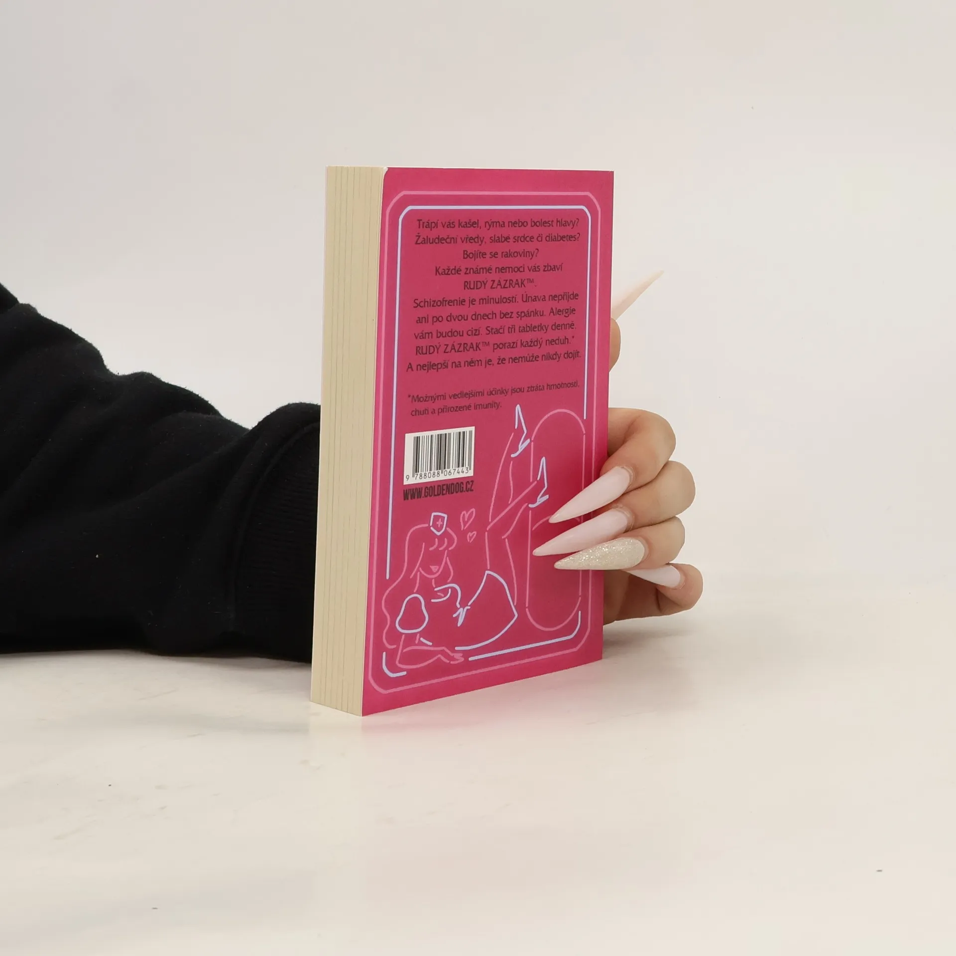 Trápí vás kašel, rýma nebo bolest hlavy? Žaludeční vředy, slabé srdce či diabetes? Bojíte se rakoviny? Každé známe nemoci vás zbaví RUDÝ ZÁZRAK™.* Schizofrenie je minulostí. Únava nepřijde ani po dvou dnech bez spánku. Alergie vám budou cizí. Stačí tři tabletky denně. RUDÝ ZÁZRAK™ porazí každý neduh. A nejlepší na něm je, že nemůže nikdy dojít. * Možnými vedlejšími účinky jsou ztráta hmotnosti, chuti a přirozené imunity.