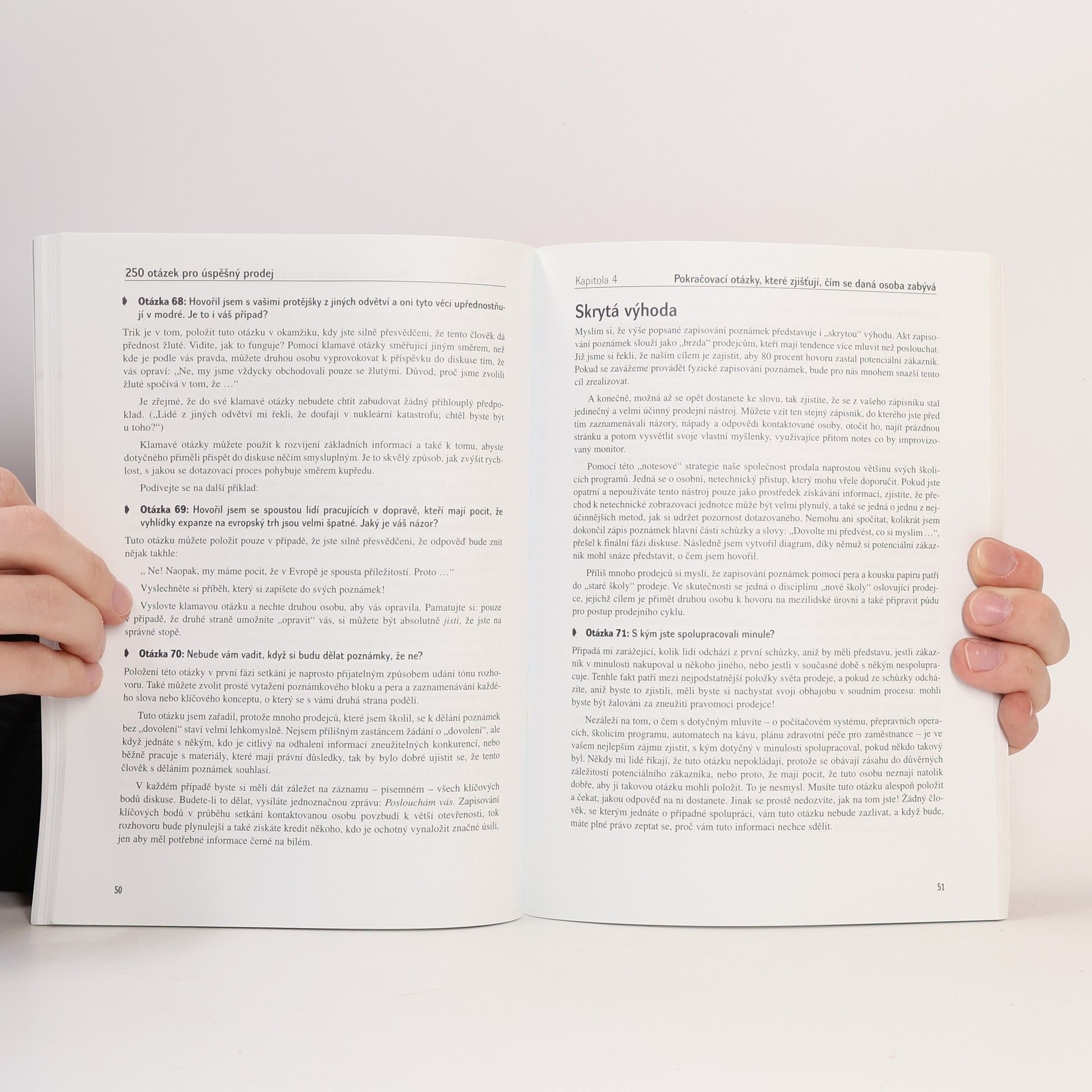 Obratné otázky a odpovědi, díky nimž z jednání odejdete jako vítěz – pokaždé! Chcete-li více prodávat, musíte uzavírat více dohod – Stephan Schiffman zná všechny potřebné triky a techniky. Jsou uspořádány do jednoduchého formátu otázek a odpovědí, který vám umožní osvojit si nové strategie prakticky přes noc. Tato nová Schiffmanova kniha je zlatým dolem praktických informací pro všechny prodejce a obchodní zástupce – nováčky i ostřílené veterány. Kniha 250 otázek pro úspěšný prodej nabízí špičkové otázky, které vám pomohou v šesti stěžejních oblastech: - Navázání kontaktu s potenciálními klienty - Budování vztahu s vašimi zákazníky - Zdolání námitek a zajištění „dalšího kroku“ v případě každého potenciálního zákazníka - Vytvoření prezentace „šité na míru“ - Vypořádání se s překážkami a problémy - Vyjednávání a dokončení co nejlepší dohody Nezáleží na tom, co prodáváte – nebo komu to prodáváte – s touto knihou toho prodáte mnohem víc!