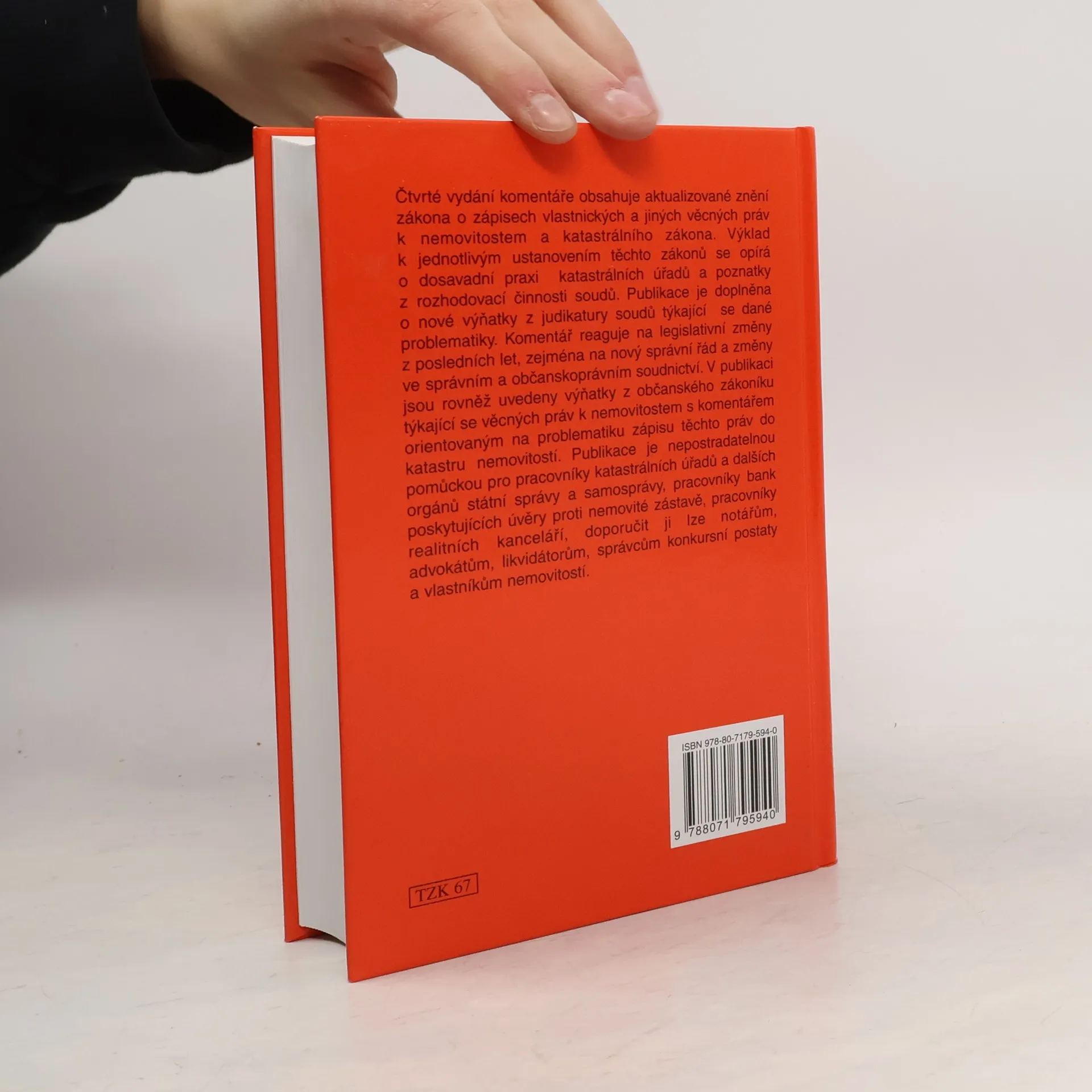 Čtvrté vydání komentáře obsahuje aktualizované znění zákona o zápisech vlastnických a jiných věcných práv k nemovitostem a katastrálního zákona. Výklad k jednotlivým ustanovením těchto zákonů se opírá o dosavadní praxi katastrálních úřadů a poznatky z rozhodovací činnosti soudů. Publikace je doplněna o nové výňatky z judikatury soudů týkající se dané problematiky. Komentář reaguje na legislativní změny z posledních let, zejména na nový správní řád a změny ve správním a občanskoprávním soudnictví. V publikaci jsou rovněž uvedeny výňatky z občanského zákoníku týkající se věcných práv k nemovitostem s komentářem orientovaným na problematiku zápisu těchto práv do katastru nemovitostí. Publikace je nepostradatelnou pomůckou pro pracovníky katastrálních úřadů a dalších orgánů státní správy a samosprávy, pracovníky bank poskytujících úvěry proti nemovité zástavě, pracovníky realitních kanceláří, doporučit ji lze notářům, advokátům, likvidátorům, správcům konkursní podstaty a vlastníkům nemovitostí.