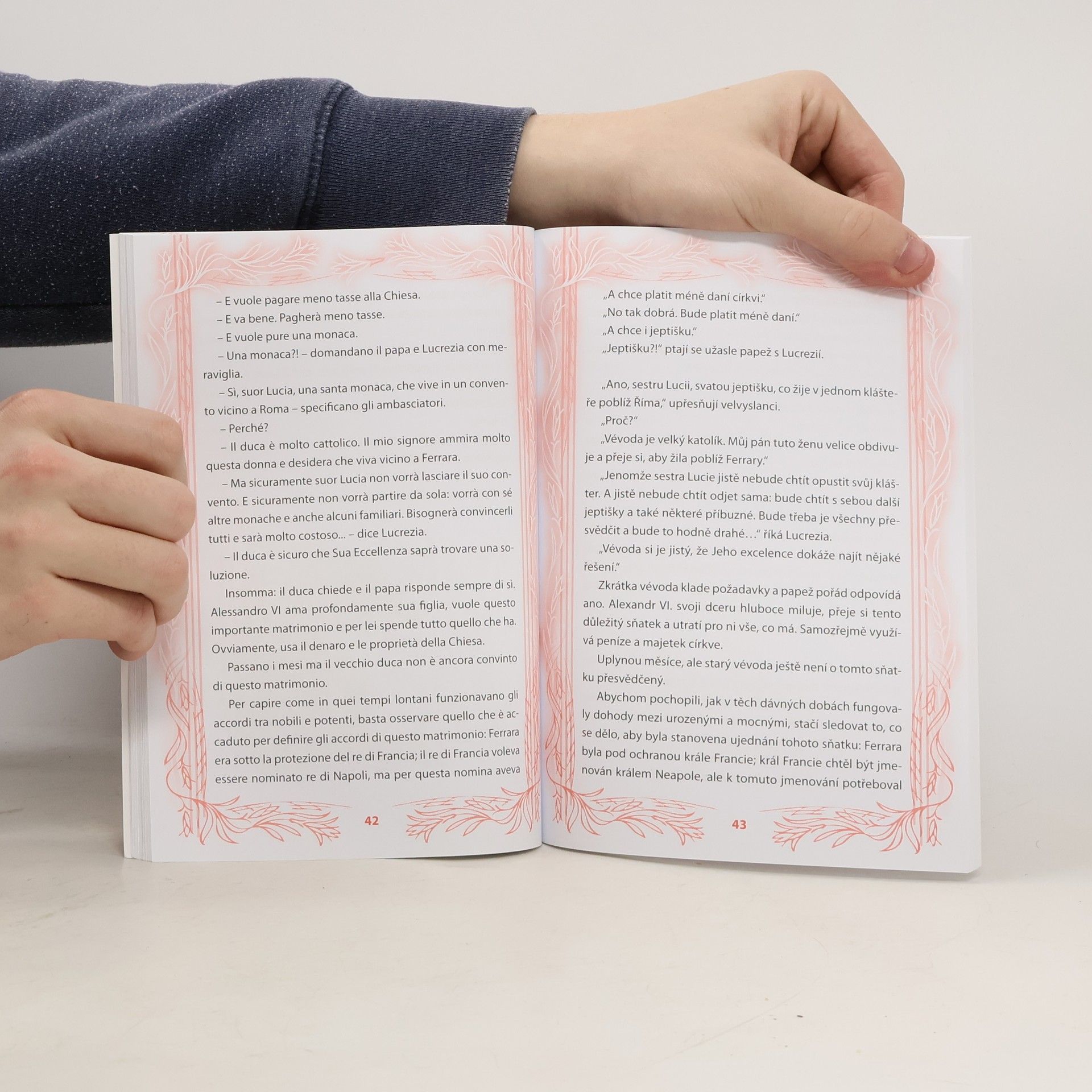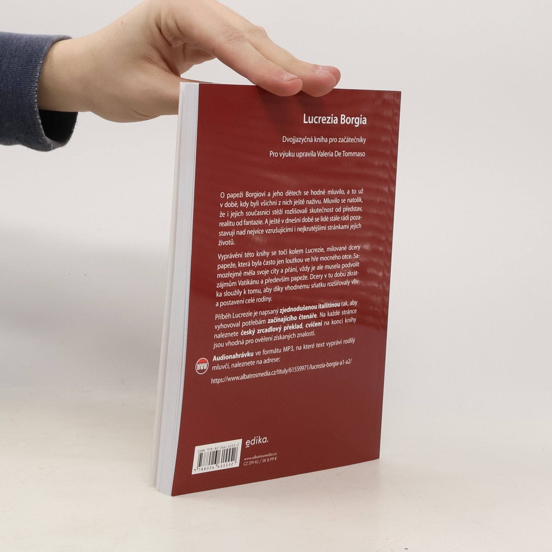 O papeži Borgiovi a jeho dětech se hodně mluvilo, a to už v době, kdy byli všichni z nich ještě naživu. Mluvilo se natolik, že i jejich současníci stěží rozlišovali skutečnost od představ, realitu od fantazie. A ještě v dnešní době se lidé stále rádi pozastavují nad nejvíce vzrušujícími i nejkrutějšími stránkami jejich životů. Vyprávění této knihy se točí kolem Lucrezie, milované dcery papeže, která byla často jen loutkou ve hře mocného otce. Samozřejmě měla svoje city a přání, vždy je ale musela podvolit zájmům Vatikánu a především papeže. Dcery v tu dobu zkrátka sloužily k tomu, aby díky vhodnému sňatku rozšiřovaly vliv a postavení celé rodiny. Příběh Lucrezie je napsaný zjednodušenou italštinou tak, aby vyhovoval potřebám začínajícího čtenáře. Na každé stránce naleznete český zrcadlový překlad, cvičení na konci knihy jsou vhodná pro ověření získaných znalostí. Audionahrávka ve formátu MP3, na které text vypraví rodilý mluvčí, je zdarma ke stažení na webu.