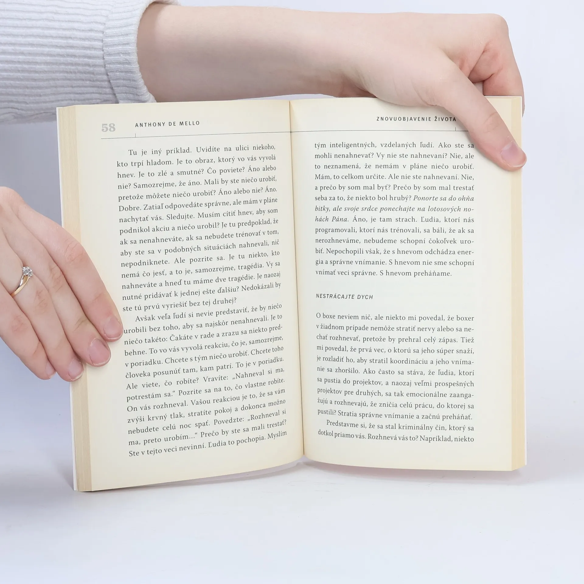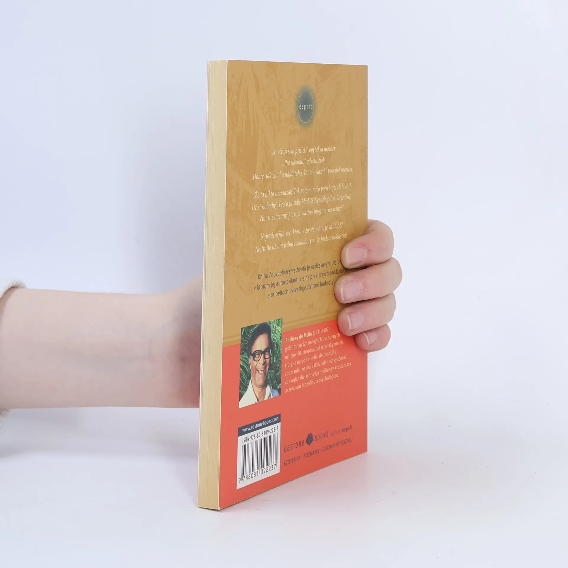 Kniha Znovuobjavenie života je nadčasovým dielom, v ktorom jej autor brilantne a na praktických príkladoch a príbehoch vysvetľuje životné hodnoty. Anthony de Mello (1931 – 1987), jeden z najvýznamnejších duchovných učiteľov 20. storočia, bol jezuitský mních, ktorý sa narodil v Indii, ale pôsobil aj v zahraničí, najmä v USA, kde tiež vyučoval. Vo svojich diela spája myšlienky kresťanstva so zenovou filozofiou a psychológiou. „Prečo si sem prišiel?“ opýtal sa majster. „Pre slobodu,“ odvetil žiak. „Dobre, tak choď a nájdi toho, kto ťa zviazal,“ povedal majster. „Hovoríš, že ťa nikto nezviazal? Tak potom, načo potrebuješ slobodu? Už si slobodný. Prečo ju stále hľadáš? Nepochopil si, že jediné, čím si zviazaný, je tvoja vlastná imaginárna reťaz?“ Najvzácnejšia vec, ktorú v živote máte, je váš ČAS! Nestraťte už ani jednu sekundu tým, že budete nešťastní!