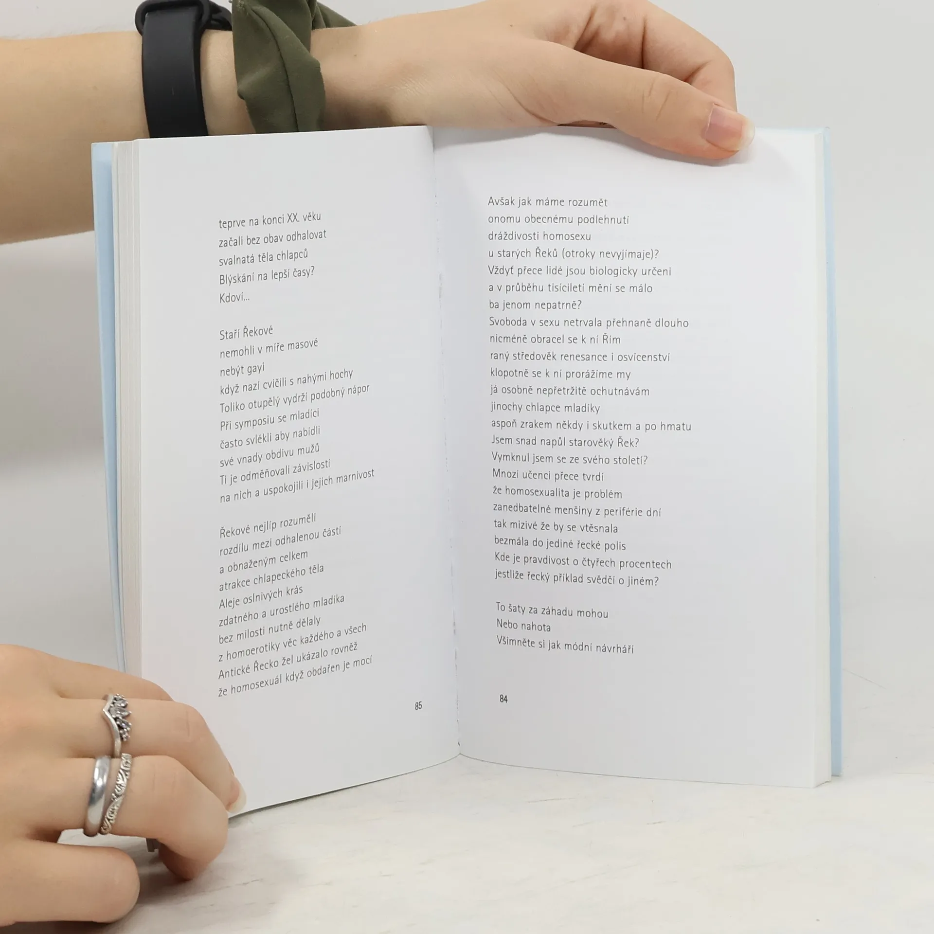 Nekonvenční sbírka vychází pod pseudonymem a v naléhavých verších intimní lyriky otevírá donedávna tabuizovanou otázku homosexuálních vztahů. (anotace Městské knihovny v Praze)