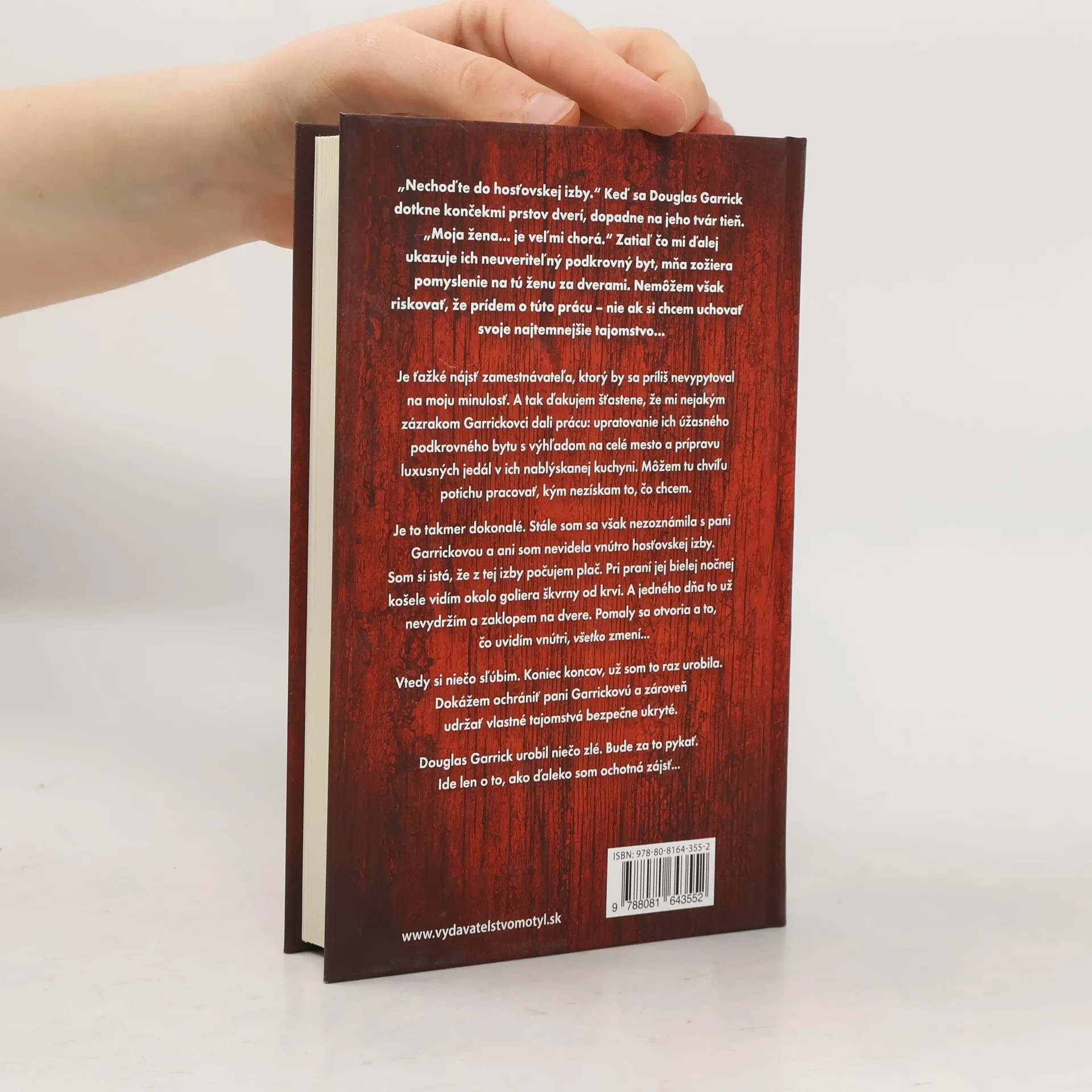 Je ťažké nájsť zamestnávateľa, ktorý by sa príliš nevypytoval na moju minulosť. A tak ďakujem šťastene, že mi nejakým zázrakom Garrickovci dali prácu: upratovanie ich úžasného podkrovného bytu s výhľadom na celé mesto a prípravu luxusných jedál v ich nablýskanej kuchyni. Môžem tu chvíľu potichu pracovať, kým nezískam to, čo chcem. Je to takmer dokonalé. Stále som sa však nezoznámila s pani Garrickovou a ani som nevidela vnútro hosťovskej izby. Som si istá, že z tej izby počujem plač. Pri praní jej bielej nočnej košele vidím okolo goliera škvrny od krvi. A jedného dňa to už nevydržím a zaklopem na dvere. Pomaly sa otvoria a to, čo uvidím vnútri, všetko zmení... Vtedy si niečo sľúbim. Koniec koncov, už som to raz urobila. Dokážem ochrániť pani Garrickovú a zároveň udržať vlastné tajomstvá bezpečne ukryté. Douglas Garrick urobil niečo zlé. Bude za to pykať. Ide len o to, ako ďaleko som ochotná zájsť...