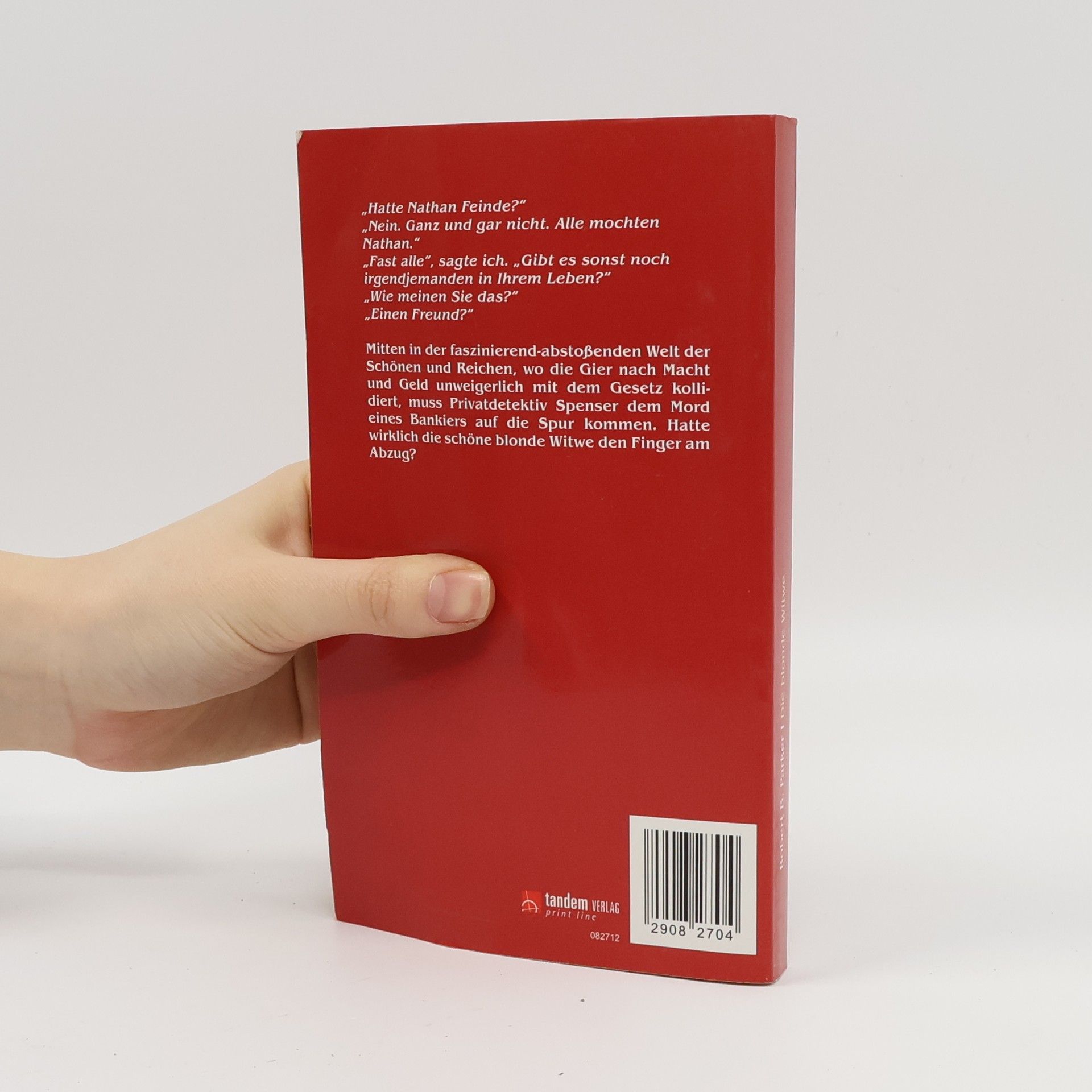 Der Bankier Nathan Smith wird eines Abends tot in seinem Bett aufgefunden. Von der Tatwaffe fehlt jede Spur und alles spricht dafür, dass seine junge Frau Mary den Finger am Abzug hatte. Dank Nathans Millionen kann sie sich an ein renommiertes Anwaltsbüro wenden. Doch selbst ihre Anwältin zweifelt an der Unschuld der blonden Witwe und engagiert den Privatdetektiv Spenser, um den Fall aufzuklären. Spenser hat zunächst keine heiße Spur, bis plötzlich eine Frau, die bei Nathan Smiths Bank entlassen wurde, tot aufgefunden wird. Er stößt bei seinen weiteren Ermittlungen auf ein bislang gut gehütetes Geheimnis in Marys Vergangenheit. Mit seinen knappen, frischen Dialogen und den scharf gezeichneten Charakteren ist „Die blonde Witwe“ ein weiterer Triumph im Werk von Robert B. Parker, der in den USA ein Bestseller-Autor ist. Seit seinem Debüt „Spenser und das gestohlene Manuskript“ im Jahr 1973 sind über dreißig Spenser- Krimis erschienen, die international sehr erfolgreich sind. In den USA lief viele Jahre die erfolgreiche Fernsehserie „Spenser“ mit Robert Urich in der Hauptrolle.