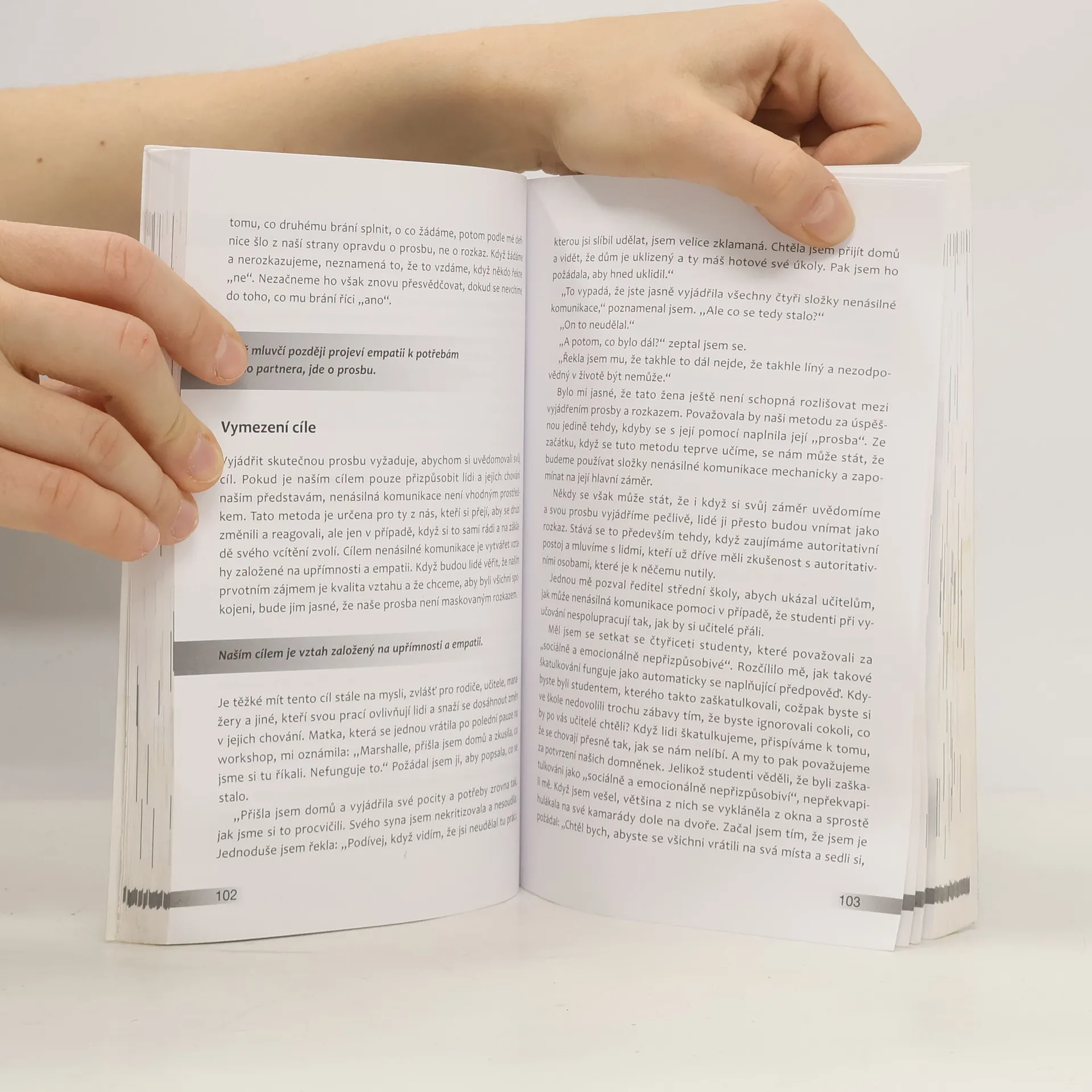 Většina z nás byla vychovávána k posuzování, soutěživosti, ke kladení požadavků a ke komunikaci s lidmi v termínech, co je „správné“ a co „špatné“. Komunikace v tomto smyslu často vede k nedorozuměním. Koncept NVC (Nonviolent Communication) – tedy koncept nenásilné komunikace – který rozvinul M. B. Rosenberg, představuje ucelený výcvik v komunikaci a je založen na naslouchání sobě i partnerovi, ochotě vnímat potřeby a pocity vlastní i druhého. Metoda NVC osvobozuje komunikaci od negativních zkušeností, pomáhá překonávat navyklé vzorce v jednání s druhými, napomáhá k řešení konfliktů a rozvíjí vztahy založené na úctě a kooperaci. Knihu ocení čtenáři se zájmem o témata efektivní komunikace, školitelé v oblasti komunikace, učitelé a vychovatelé. 4. vydání