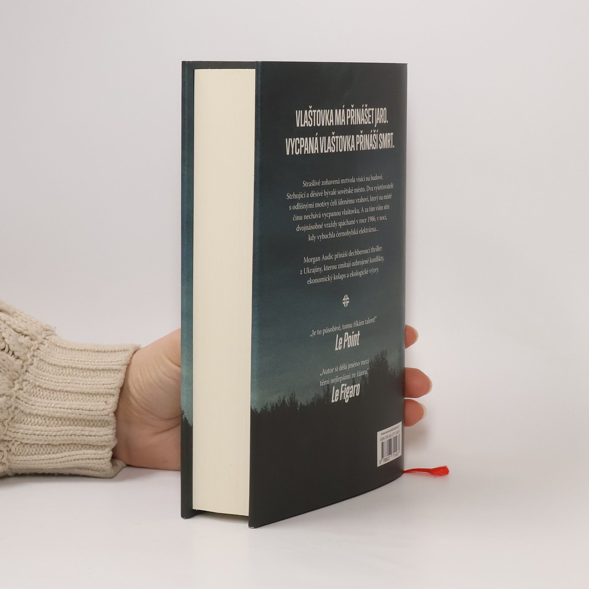 Zvrácený způsob zavraždění jistého Leonida Sokolova, jehož mrtvola je vyvěšena jako prapor na fasádě vysoké budovy, upoutá čtenářovu pozornost v samém úvodu románu. Okamžitě je vtažen do napínavého pátrání po vrahovi, jenž jako podpis zanechává na místě činu vycpanou vlaštovku. Bez pilulky jódu i nezbytné dekontaminace se ocitá přímo na místě havárie z roku 1986, v Černobylu. Ještě je tu ve vzduchu cítit hrozba neviditelného, vzpomínka na apokalypsu a úsek našich dějin, na jehož půdu tento literární žánr dosud nevstoupil.Audic ve svém druhém detektivním románu mistrně vystavěl poutavý příběh, který se odehrává v dnešní době, ale ohlíží se do třicet let vzdálené minulosti. Kapitán Josef Melnyk za ukrajinskou policii a ruský míšenec Rybalko jako soukromý detektiv paralelně vyšetřují zločin v městě Pripjať, někdejší výkladní skříni Sovětského svazu. Právě éra komunismu je v příběhu stále pevně prorostlá do současné Ukrajiny, poznamenané geopolitickými konflikty, hospodářskou krizí a společenským i národním přerodem.
