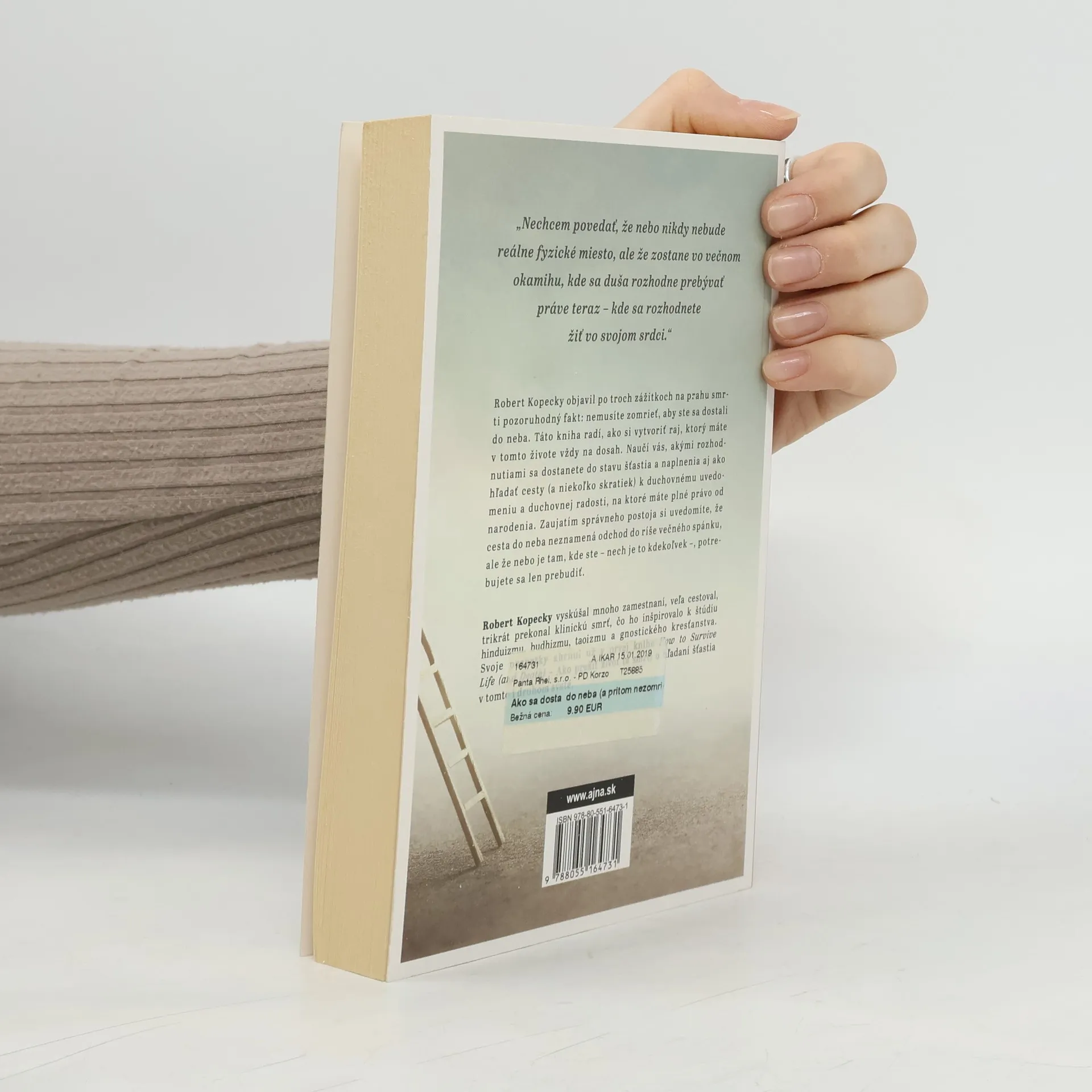 Poznanie človeka, ktorý trikrát prežil vlastnú smrť„Nechcem povedať, že nebo nikdy nebude reálne fyzické miesto, ale že zostane vo večnom okamihu, kde sa duša rozhodne prebývať práve teraz – kde sa rozhodnete žiť vo svojom srdci.“Robert Kopecky objavil po troch zážitkoch na prahu smrti pozoruhodný fakt: nemusíte zomrieť, aby ste sa dostali do neba. Táto kniha radí, ako si vytvoriť raj, ktorý máte v tomto živote vždy na dosah. Naučí vás, akými rozhodnutiami sa dostanete do stavu šťastia a naplnenia aj ako hľadať cesty (a niekoľko skratiek) k duchovnému uvedomeniu a duchovnej radosti, na ktoré máte plné právo od narodenia. Zaujatím správneho postoja si uvedomíte, že cesta do neba neznamená odchod do ríše večného spánku, ale že nebo je tam, kde ste – nech je to kdekoľvek –, potrebujete sa len prebudiť.