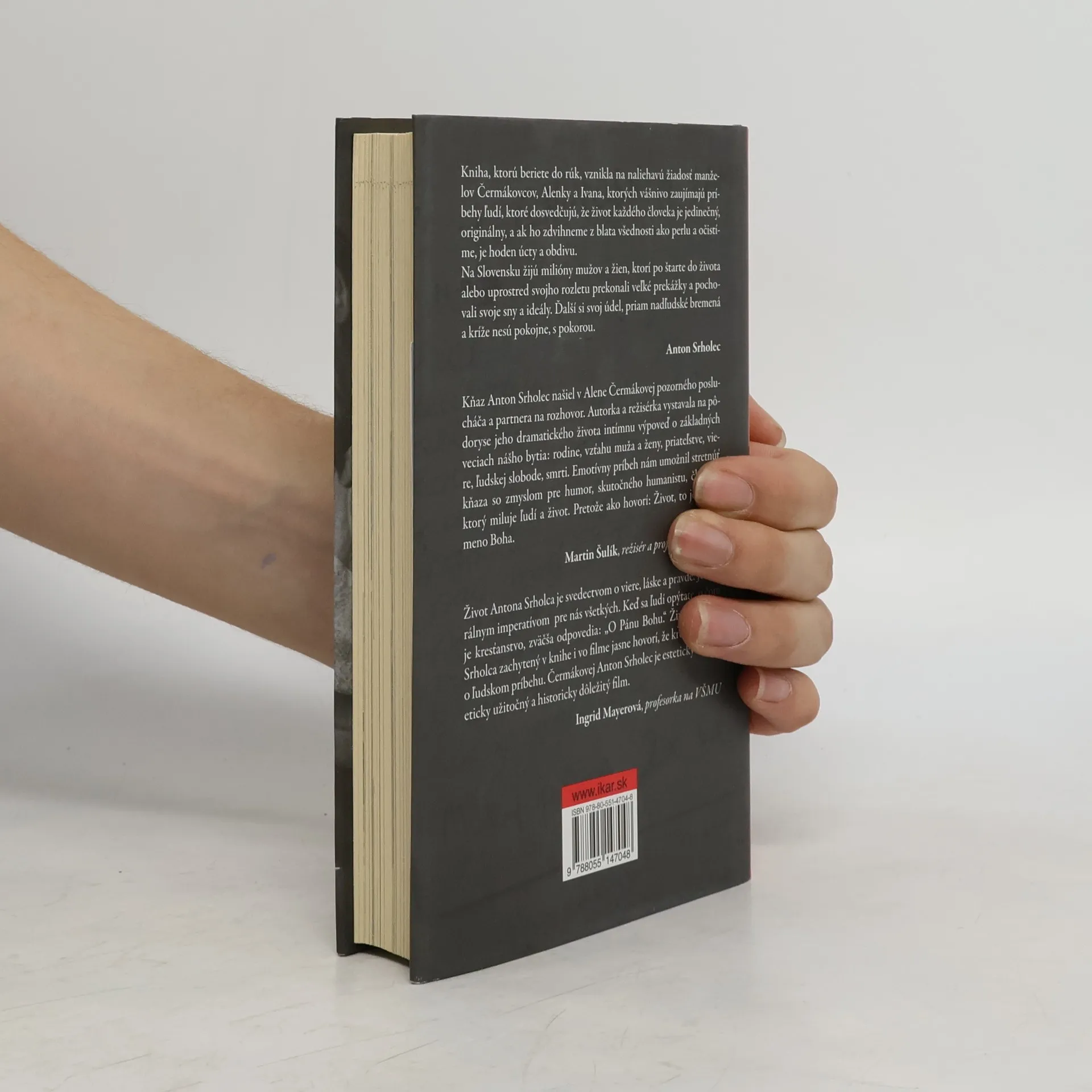 Silný životný príbeh Antona Srholca, rímskokatolíckeho kňaza, saleziána, spisovateľa, charitatívneho pracovníka, politického väzňa a buriča, ale predovšetkým láskavého človeka, ktorý nikdy neopustil svoje zásady a vždy bojoval za lepší svet, zachytila v celovečernom dokumentárnom filme režisérka Alena Čermáková. Rozhovory s Antonom Srholcom spočiatku viedla u seba doma pri raňajkách. Neskôr vznikla potreba zaznamenať ich a začal sa rodiť podklad pre knihu, v ktorej sa autorka snažila zachovať autenticitu Srholcových slov, aby priblížila ľuďom jeho zmýšľanie o svete i o Bohu čo najpravdivejšie, najvernejšie. Rozhovory a úvahy predstavujú čitateľom minulé i súčasné dni tohto výnimočného muža. Umožňujú im nahliadnuť do spôsobu jeho premýšľania a činov, odhalia jeho húževnatosť, túžbu pomáhať a milovať ľudí až na smrť. Autorka neprináša len Srholcov portrét, ale predovšetkým vyjadruje úctu mužovi, ktorý nám ukazuje smer na ceste životom. Knihu dopĺňajú fotografie zo súkromného archívu Antona Srholca a jeho najbližších, ale aj dokumenty z leopoldovskej väznice a umelecké fotografie Maňa Štraucha.