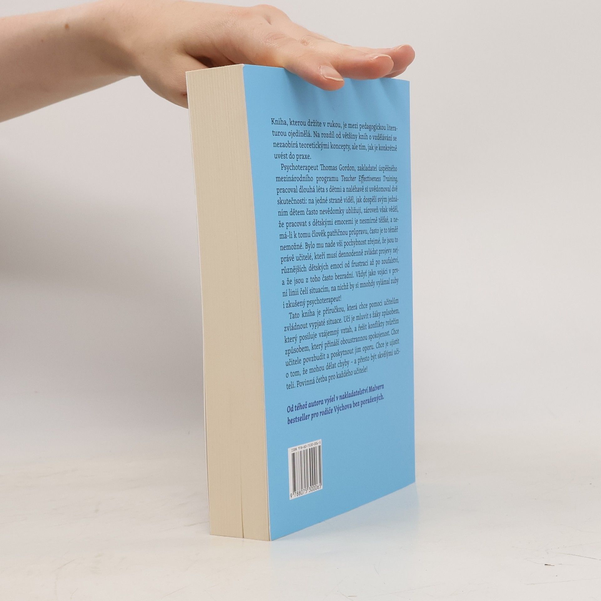 Kniha, kterou držíte v rukou, je mezi pedagogickou literaturou ojedinělá. Na rozdíl od většiny knih o vzdělávání se nezaobírá teoretickými koncepty, ale tím, jak je konkrétně uvést do praxe. Tato kniha je příručkou, která chce pomoci učitelům zvládnout vypjaté situace. Učí je mluvit s žáky způsobem, který posiluje vzájemný vztah, a řešit konflikty tvůrčím způsobem, který přináší oboustrannou spokojenost. Chce učitele povzbudit a poskytnout jim oporu. Chce je ujistit o tom, že mohou dělat chyby – a přesto být skvělými učiteli. Povinná četba pro každého učitele! Psychoterapeut Thomas Gordon, zakladatel úspěšného mezinárodního programu Teacher Effectiveness Training, pracoval dlouhá léta s dětmi a naléhavě si uvědomoval dvě skutečnosti: Na jedné straně viděl, jak dospělí svým jednáním dětem často nevědomky ubližují. Zároveň však věděl, že pracovat s dětskými emocemi je nesmírně těžké, a nemá-li k tomu člověk patřičnou průpravu, často je to téměř nemožné. Bylo mu nade vší pochybnost zřejmé, že jsou to právě učitelé, kteří musí denodenně zvládat projevy nejrůznějších dětských emocí od frustraci až po zoufalství, a že jsou z toho často bezradní. Vždyť jako vojáci v první linii čelí situacím, na nichž by si mnohdy vylámal zuby i zkušený psychoterapeut!