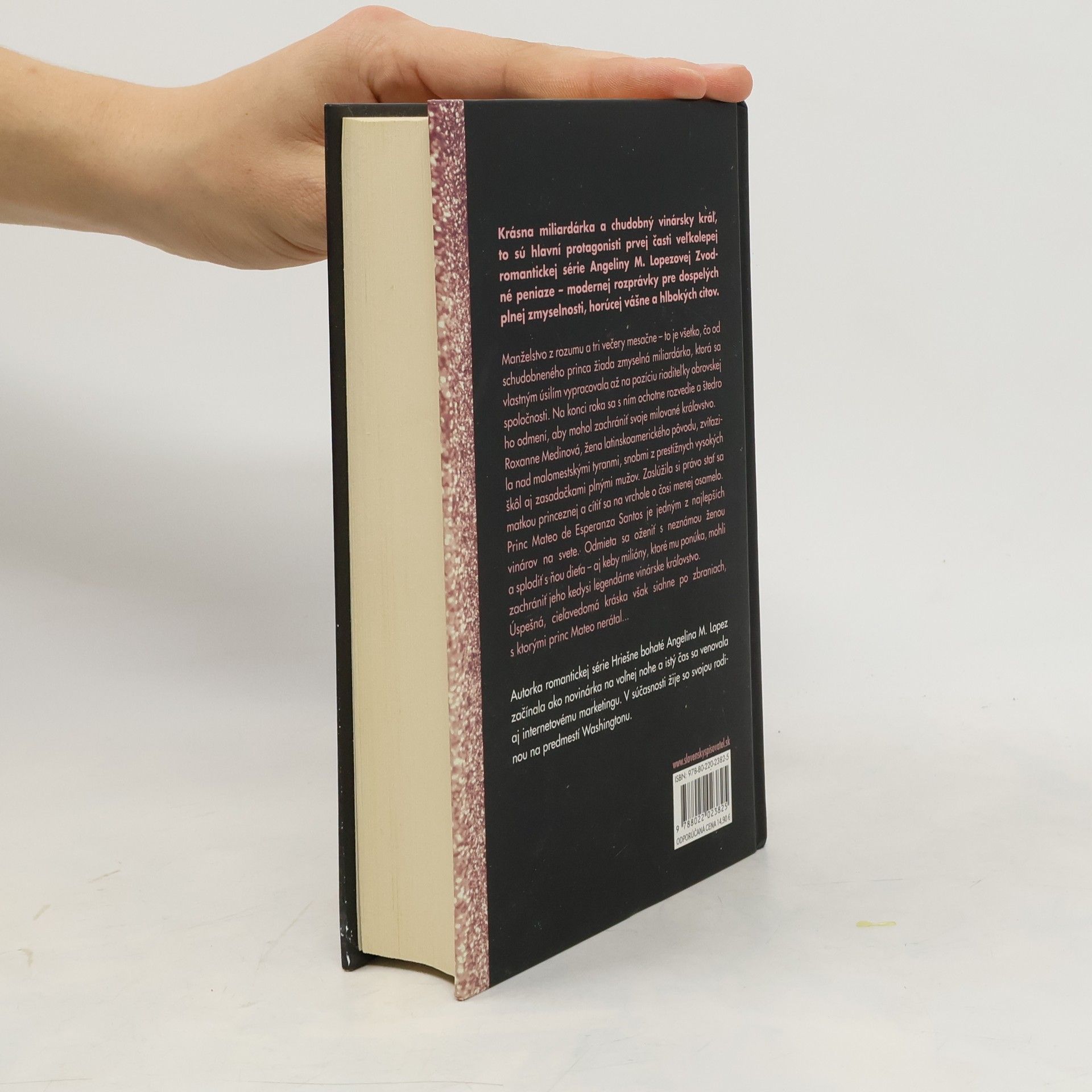 Krásna miliardárka a chudobný vinársky kráľ, to sú hlavní protagonisti prvej časti veľkolepej romantickej série Angeliny M. Lopezovej Zvodné peniaze – modernej rozprávky pre dospelých plnej zmyselnosti, horúcej vášne a hlbokých citov. Manželstvo z rozumu a tri večery mesačne – to je všetko, čo od schudobneného princa žiada zmyselná miliardárka, ktorá sa vlastným úsilím vypracovala až na pozíciu riaditeľky obrovskej spoločnosti. Na konci roka sa s ním ochotne rozvedie a štedro ho odmení, aby mohol zachrániť svoje milované kráľovstvo. Roxanne Medinová, žena latinskoamerického pôvodu, zvíťazila nad malomestskými tyranmi, snobmi z prestížnych vysokých škôl aj zasadačkami plnými mužov. Zaslúžila si právo stať sa matkou princeznej a cítiť sa na vrchole o čosi menej osamelo. Princ Mateo de Esperanza y Santos je jedným z najlepších vinárov na svete. Odmieta sa oženiť s neznámou ženou a splodiť s ňou dieťa – aj keby milióny, ktoré mu ponúka, mohli zachrániť jeho kedysi legendárne vinárske kráľovstvo. Úspešná, cieľavedomá kráska však siahne po zbraniach, s ktorými princ Mateo nerátal...