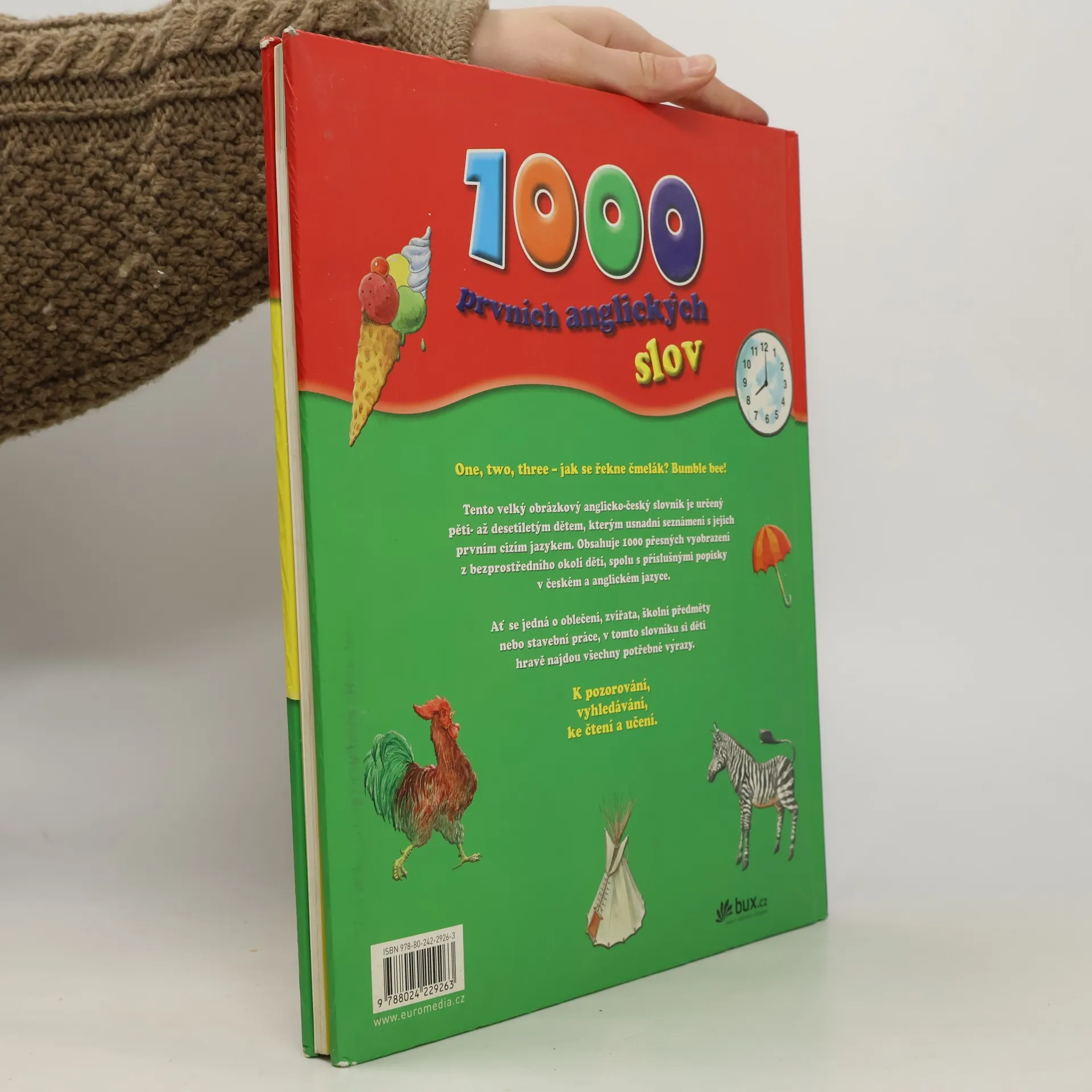 Obrázkový anglicko-český slovník je určený pěti- až desetiletým dětem, kterým usnadní seznámení s jejich prvním cizím jazykem. Obsahuje 1000 přesných vyobrazení z bezprostředního okolí dětí, spolu s příslušnými popisky v českém a anglickém jazyce. Ať se jedná o oblečení, zvířata, školní předměty nebo stavební práce, v tomto slovníku si děti hravě najdou potřebné výrazy.
