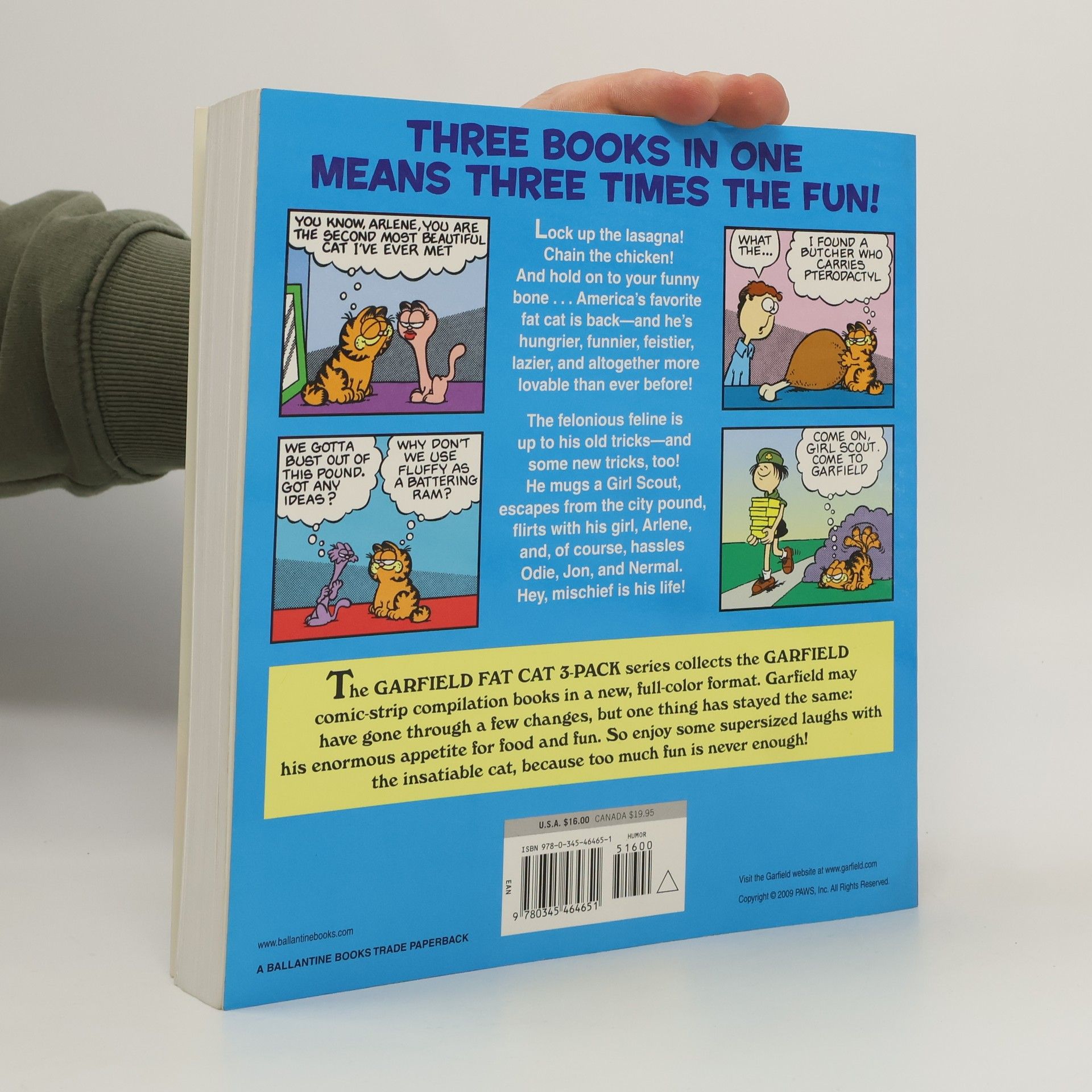 This uproarious collection includes three books in one: Garfield Weighs In, Garfield Takes the Cake, and Garfield Eats His Heart Out. The felonious feline is up to his old tricks—and some new tricks, too! He mugs a Girl Scout, escapes from the city pound, flirts with his girl, Arlene, and, of course, hassles Odie, Jon, and Nermal. Hey, mischief is his life! The GARFIELD FAT CAT 3-PACK series collects the GARFIELD comic-strip compilation books in a new, full-color format. Garfield may have gone through a few changes, but one thing has stayed the same: his enormous appetite for food and fun. So enjoy some super sized laughs with the insatiable cat, because too much fun is never enough!