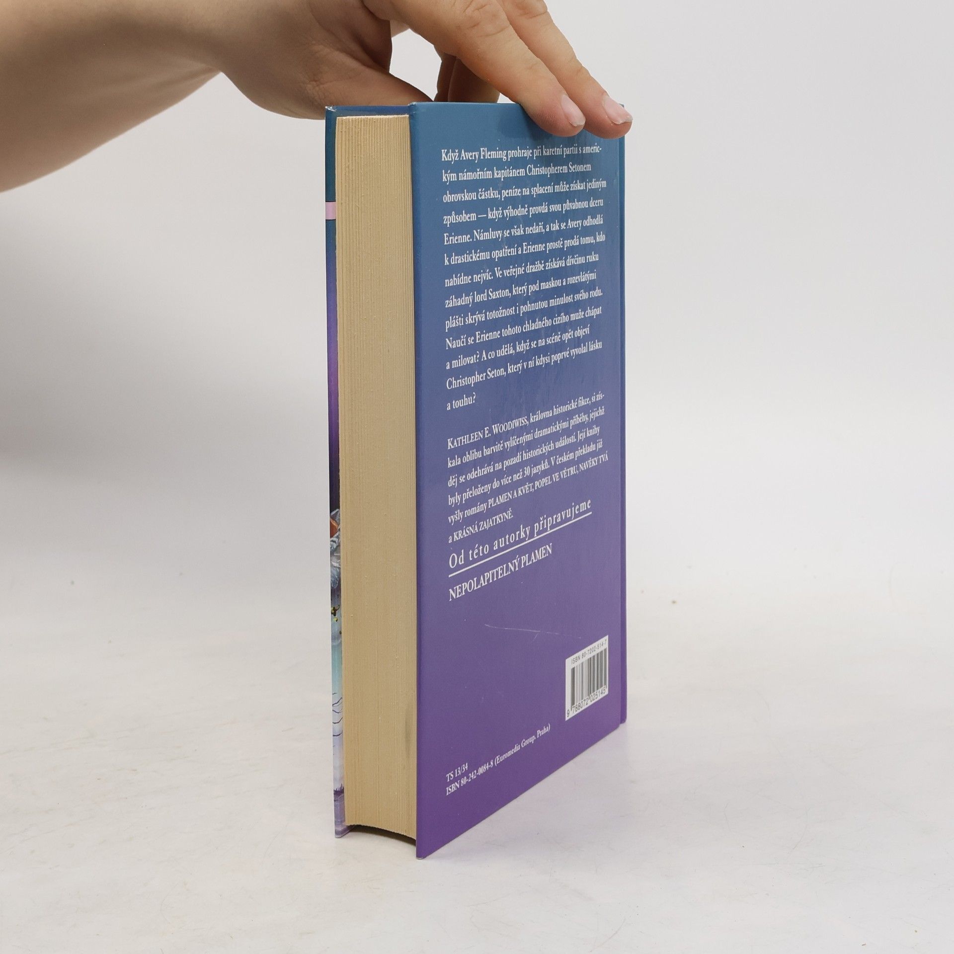 Severní Anglie 1792 Když Avery Fleming prohraje při karetní partii s americkým námořním kapitánem Christopherem Setonem obrovskou částku, peníze na splacení může získat jediným způsobem - když výhodně provdá svou půvabnou dceru Erienne. Námluvy se však nedaří, a tak se Avery odhodlá k drastickému opatření a Erienne prostě prodá tomu, kdo nabídne nejvíc. Ve veřejné dražbě získává dívčinu ruku záhadný lord Saxton, který pod maskou a rozevlátými plášti skrývá totožnost i pohnutou minulost svého rodu. Naučí se Erienne tohoto chladného cizího muže chápat a milovat? A co udělá, když se na scéně opět objeví Christopher Seton, který v ní kdysi poprvé vyvolal lásku a touhu? Kathleen E. Woodiwiss patří k nejslavnějším autorkám historických romancí a její knihy se překládvají do více než třiceti jazyků.