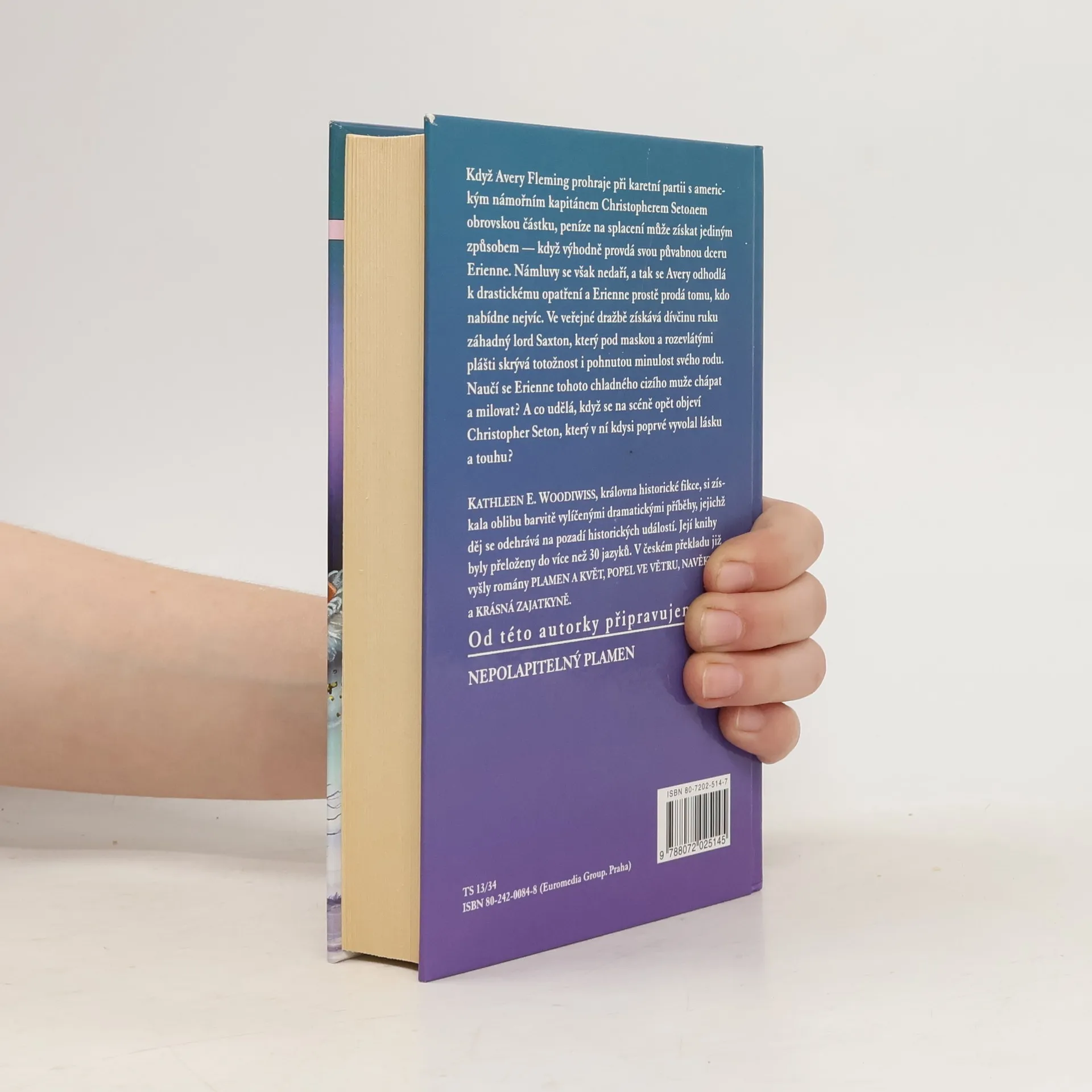 Severní Anglie 1792 Když Avery Fleming prohraje při karetní partii s americkým námořním kapitánem Christopherem Setonem obrovskou částku, peníze na splacení může získat jediným způsobem - když výhodně provdá svou půvabnou dceru Erienne. Námluvy se však nedaří, a tak se Avery odhodlá k drastickému opatření a Erienne prostě prodá tomu, kdo nabídne nejvíc. Ve veřejné dražbě získává dívčinu ruku záhadný lord Saxton, který pod maskou a rozevlátými plášti skrývá totožnost i pohnutou minulost svého rodu. Naučí se Erienne tohoto chladného cizího muže chápat a milovat? A co udělá, když se na scéně opět objeví Christopher Seton, který v ní kdysi poprvé vyvolal lásku a touhu? Kathleen E. Woodiwiss patří k nejslavnějším autorkám historických romancí a její knihy se překládvají do více než třiceti jazyků.