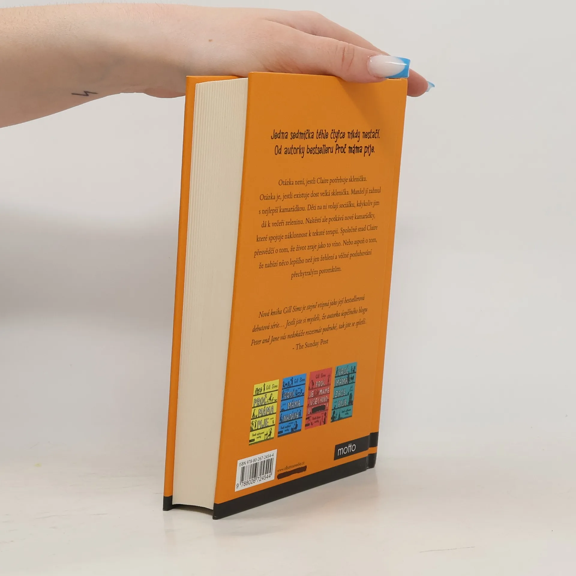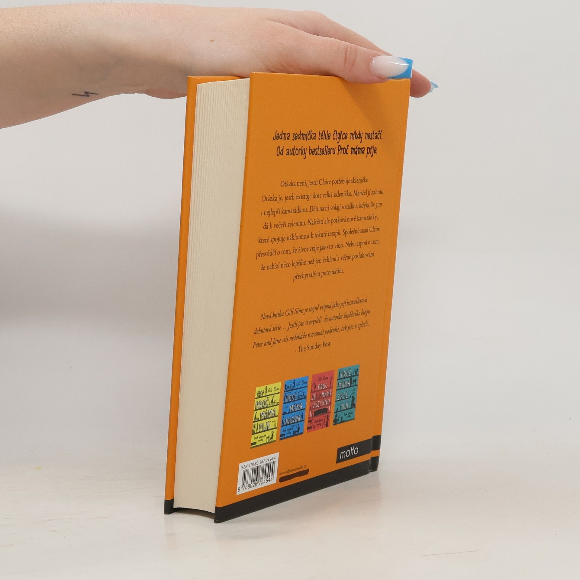 Jedna sedmička téhle čtyřce nikdy nestačí. Od autorky bestselleru Proč máma pije. Otázka není, jestli Claire potřebuje skleničku. Otázka je, jestli existuje dost velká sklenička. Manžel jí zahnul s nejlepší kamarádkou. Děti na ni volají sociálku, kdykoliv jim dá k večeři zeleninu. Naštěstí ale potkává nové kamarádky, které spojuje náklonnost k tekuté terapii. Společně snad Claire přesvědčí o tom, že život zraje jako to víno. Nebo aspoň o tom, že nabízí něco lepšího než jen žehlení a věčné posluhování přechytralým potomkům.