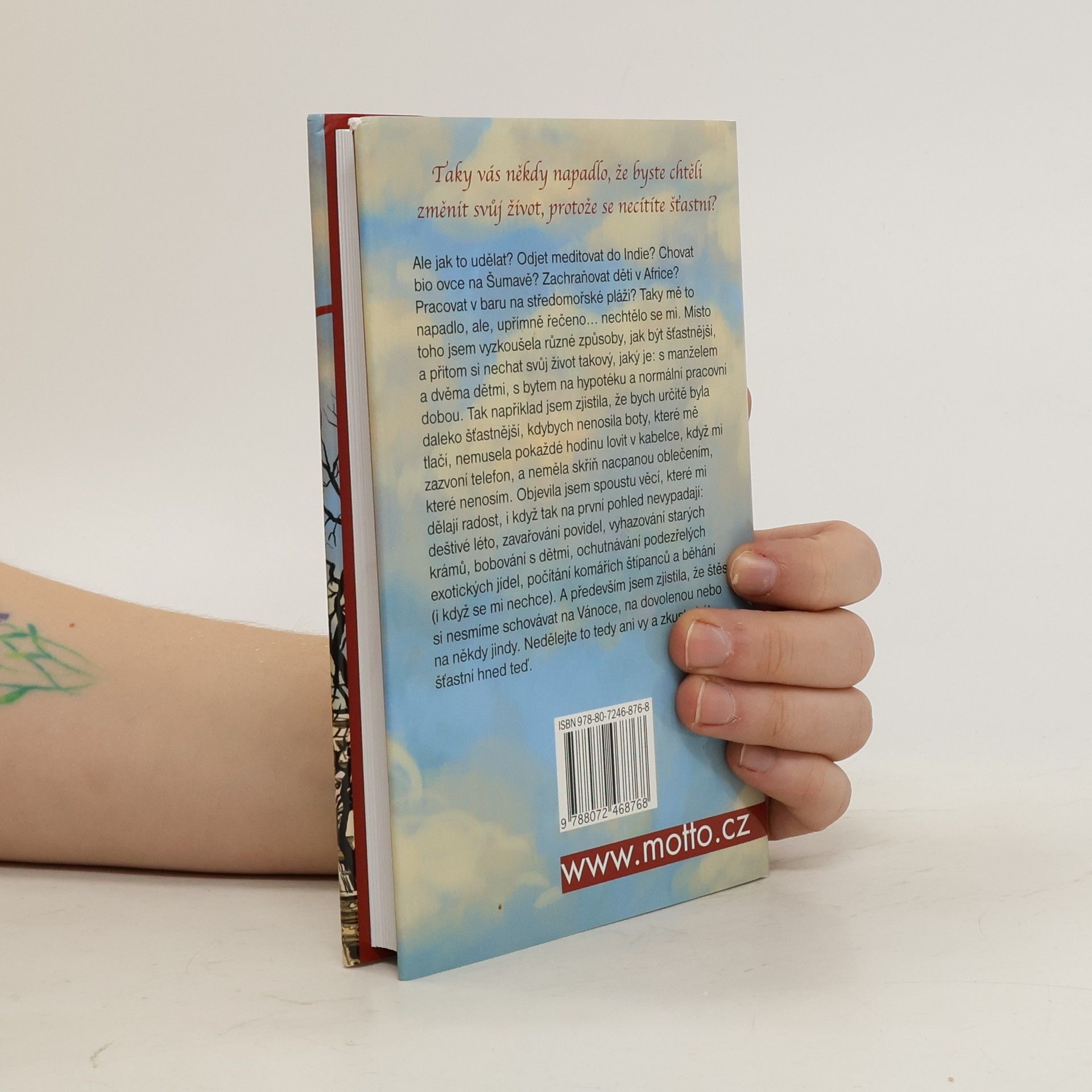 Taky vás někdy napadlo, že byste chtěli změnit svůj život? Odjet meditovat do Indie? Chovat bio ovce na Šumavě? Zachraňovat děti v Africe? Pracovat v baru na středomořské pláži? Taky mě to napadlo, ale, upřímně řečeno... nechtělo se mi. Místo toho jsem vyzkoušela různé způsoby, jak být šťastnější, a přitom si nechat svůj život takový, jaký je: s manželem a dvěma dětmi, s bytem na hypotéku a normální pracovní dobou. A zjistila jsem, že štěstí si nechci schovávat na Vánoce, na dovolenou nebo na někdy jindy.