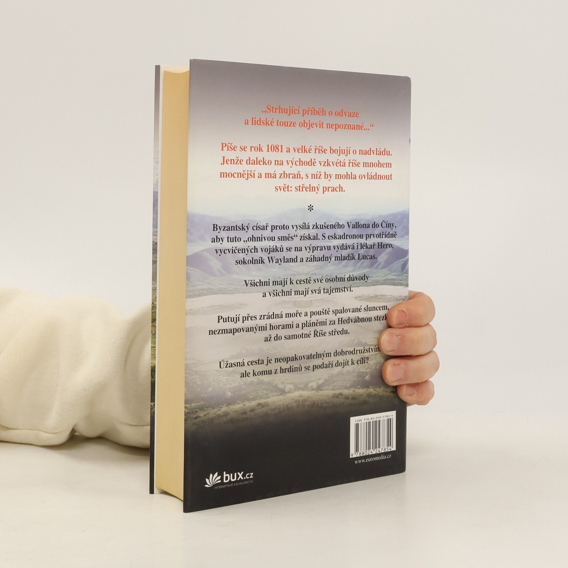 Uplynulo dlouhých devět let a hrdinové knihy Cesta sněžných ptáků se opět setkávají. Píše se rok 1081 a ctižádost byzantského císaře je bezmezná. Hodlá získat „ohnivou směs“ Východu, zázračný vybuchující prášek, který údajně mají na druhém konci světa v Číně. A tak se Vallon s přáteli vydává po Hedvábné stezce... Robert Lyndon dokázal to, co se podaří málokdy: pokračování historické ságy je opět strhující. Hlavní postavy prošly proměnou a přibyly k nim další; především záhadný mladík Lucas, který má své osobní důvody, proč se k Vallonovi připojit. Atmosféra děje vtáhne čtenáře do tehdejšího světa, vylíčeného s úžasnou barvitostí.