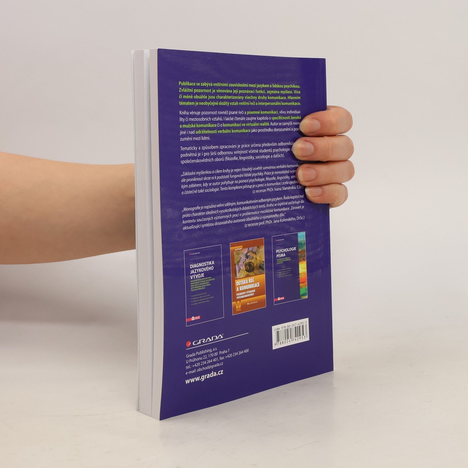 Publikace se zabývá vnitřními souvislostmi mezi jazykem a lidskou psychikou. Zvláštní pozornost je věnována její poznávací funkci, zejména myšlení. Více či méně obsáhle jsou charakterizovány všechny druhy komunikace. Hlavním tématem je neobyčejně složitý vztah vnitřní řeči a interpersonální komunikace. Kniha věnuje pozornost rovněž psané řeči a písemné komunikaci, vlivu individuality či meziosobních vztahů. I laické čtenáře zaujme kapitola o specifičnosti ženské a mužské komunikace či o komunikaci ve virtuální realitě. Autor se zamýšlí mimo jiné i nad udržitelností verbální komunikace jako prostředku dorozumění a porozumění mezi lidmi. Tematicky a způsobem zpracování je práce určena především odborníkům věnujícím se této problematice, ale podnětná je i pro širší odbornou veřejnost včetně studentů psychologie a dalších společenskovědních oborů (filozofie, lingvistiky, sociologie a dalších).