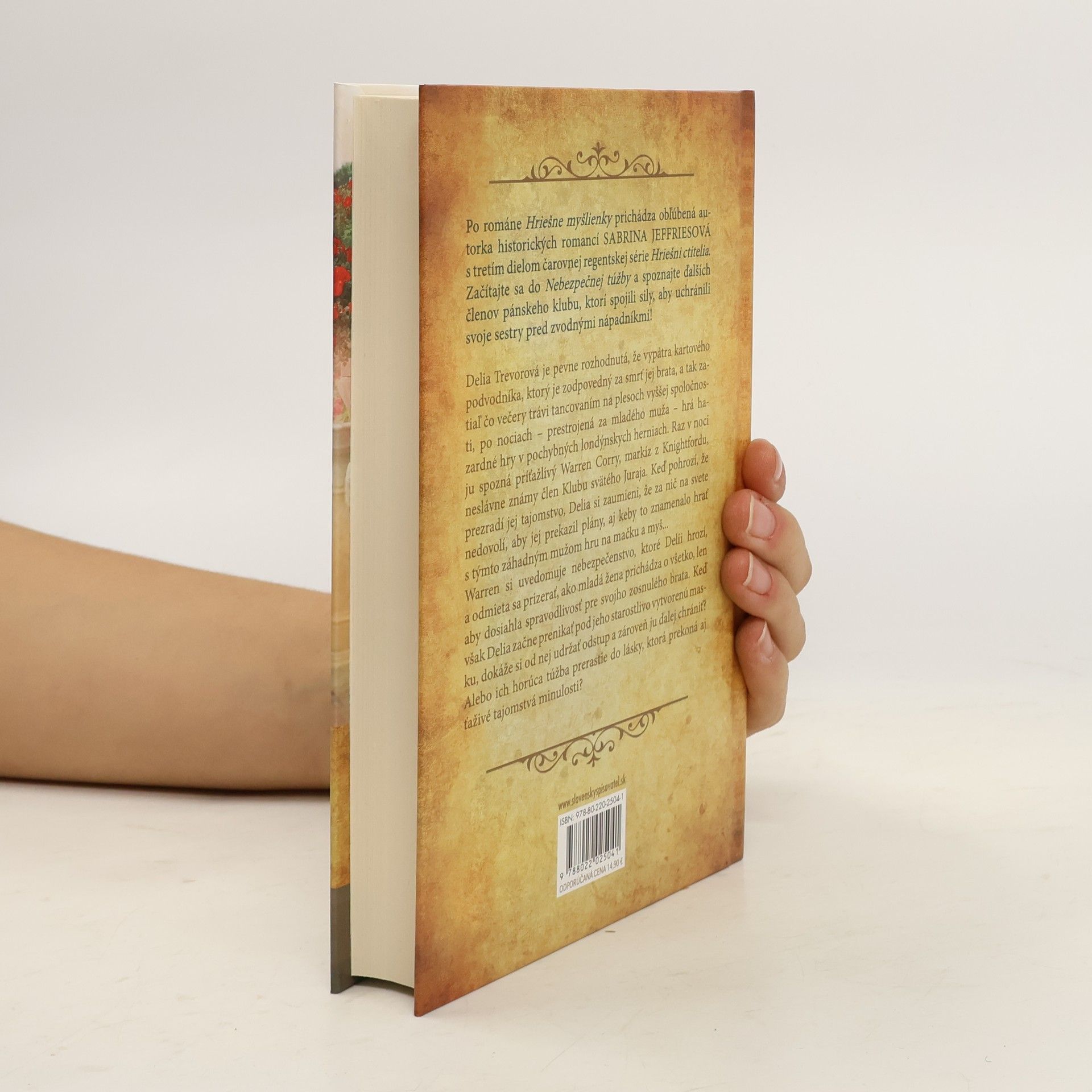 Po románoch Hriešne myšlienky a Škola zvádzania prichádza obľúbená autorka historických romancí Sabrina Jeffriesová s tretím dielom čarovnej regentskej série Hriešni ctitelia. Začítajte sa do Nebezpečnej túžby a spoznajte ďalších členov pánskeho klubu, ktorí spojili sily, aby uchránili svoje sestry pred zvodnými nápadníkmi!Delia Trevorová je pevne rozhodnutá, že vypátra kartového podvodníka, ktorý je zodpovedný za smrť jej brata, a tak zatiaľ čo večery trávi tancovaním na plesoch vyššej spoločnosti, po nociach – prestrojená za mladého muža - hrá hazardné hry v pochybných londýnskych herniach. Raz v noci ju spozná príťažlivý Warren Corry, markíz z Knightfordu, neslávne známy člen Klubu svätého Juraja. Keď pohrozí, že prezradí jej tajomstvo, Delia si zaumieni, že za nič na svete nedovolí, aby jej prekazil plány, aj keby to znamenalo hrať s týmto záhadným mužom hru na mačku a myš...Warren si uvedomuje nebezpečenstvo, ktoré Delii hrozí, a odmieta sa prizerať, ako mladá žena prichádza o všetko, len aby dosiahla spravodlivosť pre svojho zosnulého brata. Keď však Delia začne prenikať pod jeho starostlivo vytvorenú masku, dokáže si od nej udržať odstup a zároveň ju ďalej chrániť? Alebo ich horúca túžba prerastie do lásky, ktorá prekoná aj ťaživé tajomstvá minulosti?