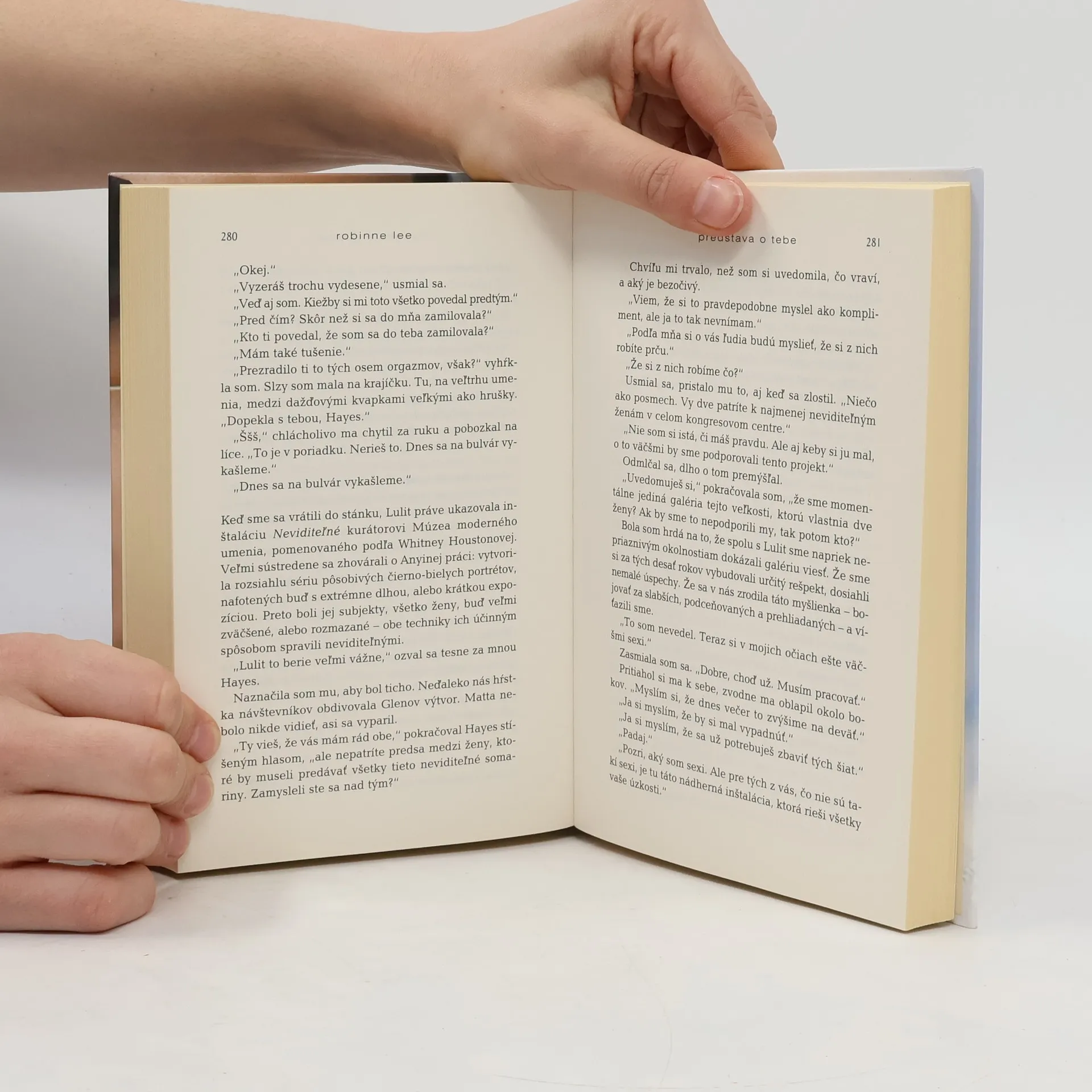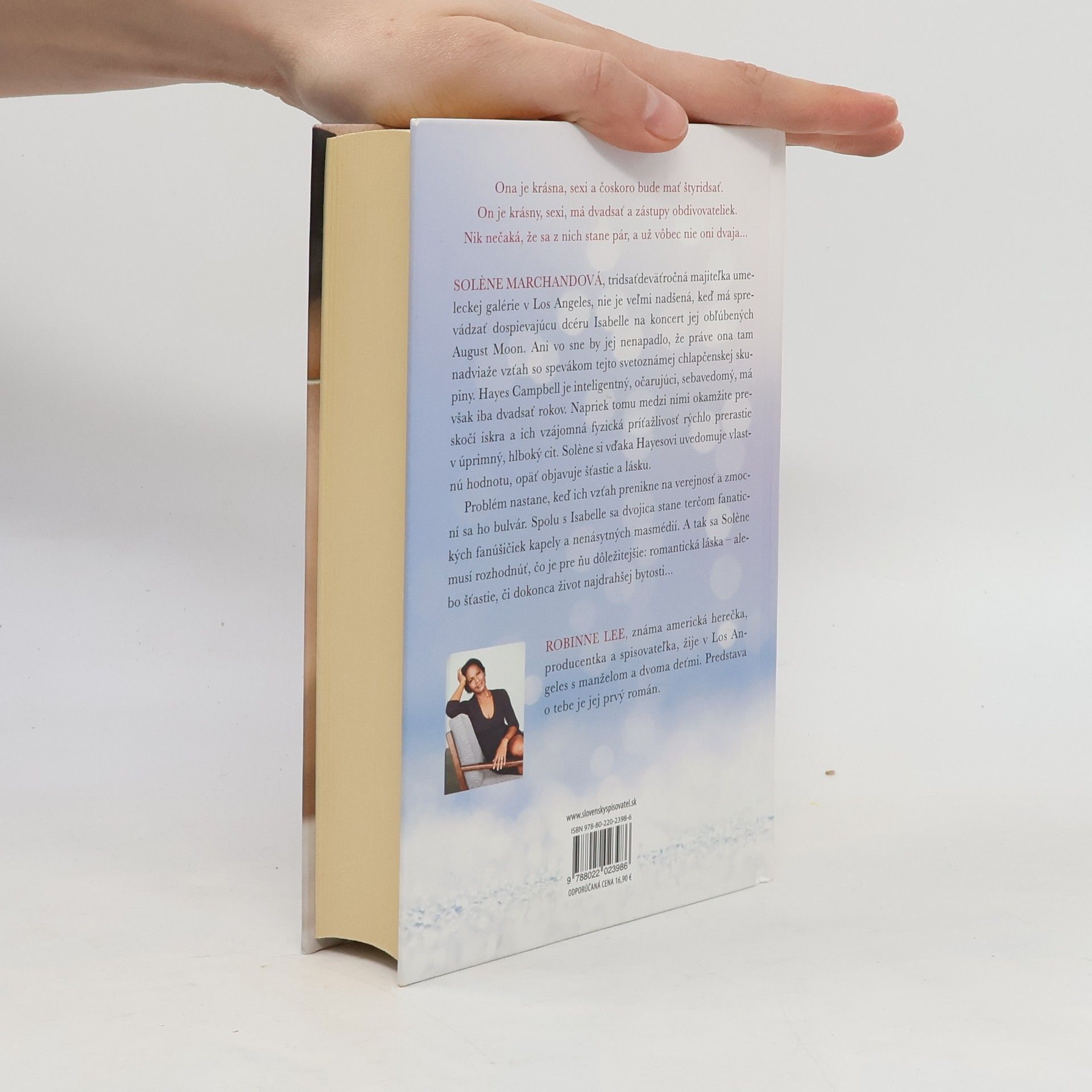 Ona je krásna, sexy a čoskoro bude mať štyridsať. On je krásny, sexy, má dvadsať a zástupy obdivovateliek. Nik nečaká, že sa z nich stane pár, a už vôbec nie oni dvaja... Solene Marchandová, tridsaťdeväťročná majiteľka umeleckej galérie v Los Angeles, nie je veľmi nadšená, keď má sprevádzať dospievajúcu dcéru Isabelle na koncert jej obľúbených August Moon. Ani vo sne by jej nenapadlo, že práve ona tam nadviaže vzťah so spevákom tejto svetoznámej chlapčenskej skupiny. Hayes Campbell je inteligentný, očarujúci, sebavedomý, má však iba dvadsať rokov. Napriek tomu medzi nimi okamžite preskočí iskra a ich vzájomná fyzická príťažlivosť rýchlo prerastie v úprimný, hlboký cit. Solene si vďaka Hayesovi uvedomuje vlastnú hodnotu, opäť objavuje šťastie a lásku. Problém nastane, keď ich vzťah prenikne na verejnosť a zmocní sa ho bulvár. Spolu s Isabelle sa dvojica stane terčom fanatických fanúšičiek kapely a nenásytných masmédií. A tak sa Solene musí rozhodnúť, čo je pre ňu dôležitejšie: romantická láska - alebo šťastie, či dokonca život najdrahšej bytosti... Robinne Lee, známa americká herečka, producentka a spisovateľka, žije v Los Angeles s manželom a dvoma deťmi. Predstava o tebe je jej prvý román.