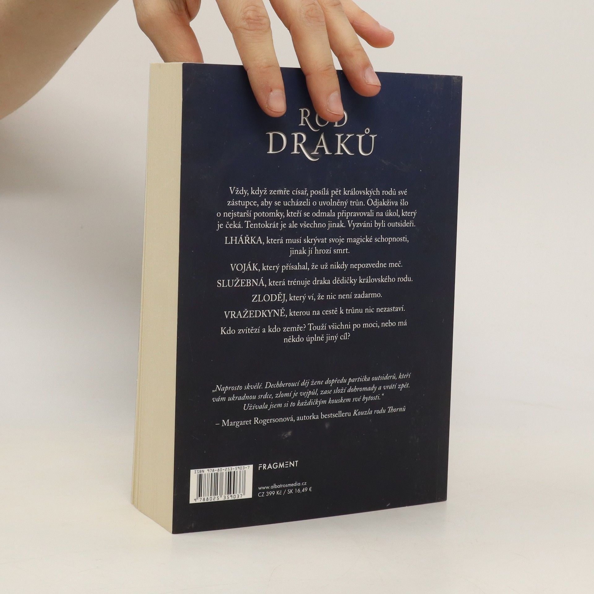 Dechberoucí fantasy, kterou žene dopředu partička outsiderů, kteří vám ukradnou srdce, zlomí je vejpůl, zase složí dohromady a vrátí zpět. Vždy, když zemře císař, posílá pět královských rodů své zástupce, aby se ucházeli o uvolněný trůn. Odjakživa šlo o nejstarší potomky, kteří se odmala připravovali na úkol, který je čeká. Tentokrát je ale všechno jinak. Vyzváni byli outsideři: lhářka, voják, služebná, zloděj a vražedkyně. Kdo získá trůn a kdo zemře? Touží všichni vyhrát, nebo má někdo úplně jiný cíl? Vždy, když zemře císař, posílá pět královských rodů své zástupce, aby se ucházeli o uvolněný trůn. Odjakživa šlo o nejstarší potomky, kteří se odmala připravovali na úkol, který je čeká. Tentokrát je ale všechno jinak. Vyzváni byli outsideři. LHÁŘKA, která musí skrývat svoje magické schopnosti, jinak jí hrozí smrt. VOJÁK, který přísahal, že už nikdy nepozvedne meč. SLUŽEBNÁ, která trénuje draka dědičky královského rodu. ZLODĚJ, který ví, že nic není zadarmo. VRAŽEDKYNĚ, kterou na cestě k trůnu nic nezastaví. Kdo zvítězí a kdo zemře? Touží všichni po moci, nebo má někdo úplně jiný cíl? „Naprosto skvělé. Dechberoucí děj žene dopředu partička outsiderů, kteří vám ukradnou srdce, zlomí je vejpůl, zase složí dohromady a vrátí zpět. Užívala jsem si to každičkým kouskem své bytosti.“ – Margaret Rogersonová, autorka bestselleru Kouzla rodu Thornů