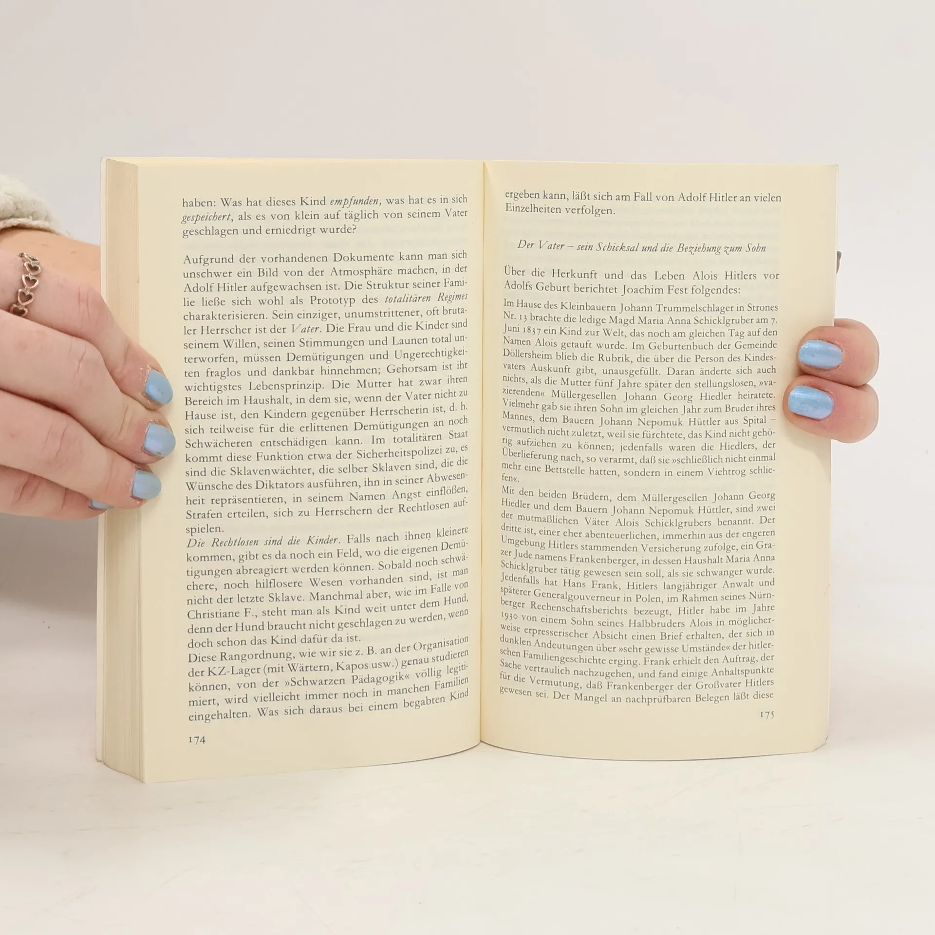 In diesem Buch öffnet uns Alice Miller die Augen über die verheerenden Folgen der Erziehung - die ja angeblich nur das Beste für das Kind will. Sie tut dies zum einen durch eine Analyse der »Schwarzen Pädagogik« und zum anderen durch die Darstellung der Kindheit einer Drogensüchtigen (Christiane F.), eines Diktators (Adolf Hitler) und eines Kindesmörders (Jürgen Bartsch). Ihr Buch verhilft uns zu einem nicht bloß intellektuellen und entsprechend folgenlosen Wissen, sondern auch zu einem emotionalen Wissen von der Tatsache, daß Psychosen, Drogensucht, Kriminalität ein verschlüsselter Ausdruck der frühesten Erfahrungen sind.