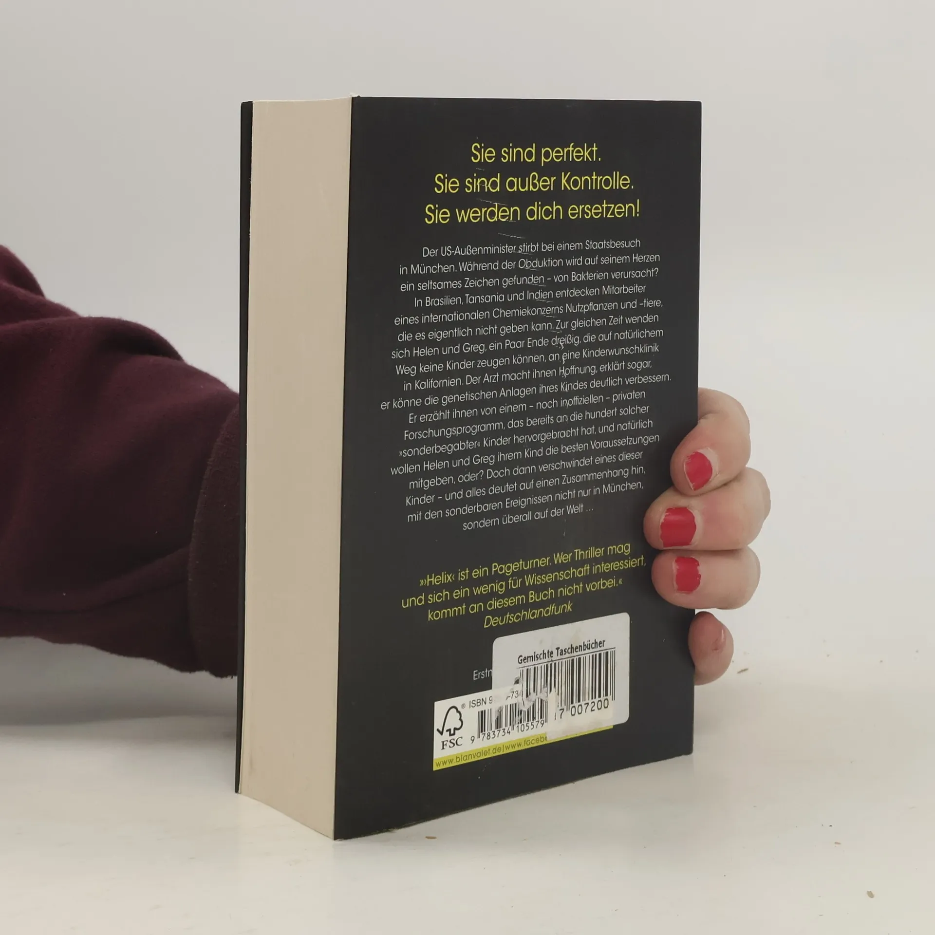 »›Helix‹ ist ein Pageturner. Wer Thriller mag und sich ein wenig für Wissenschaft interessiert, kommt an diesem Buch nicht vorbei.« Deutschlandfunk »Auslese kompakt« Sie sind perfekt. Sie sind außer Kontrolle. Sie werden dich ersetzen! Der US-Außenminister stirbt bei einem Staatsbesuch in München. Während der Obduktion wird auf seinem Herzen ein seltsames Zeichen gefunden – von Bakterien verursacht? In Brasilien, Tansania und Indien entdecken Mitarbeiter eines internationalen Chemiekonzerns Nutzpflanzen und –tiere, die es eigentlich nicht geben kann. Zur gleichen Zeit wenden sich Helen und Greg an eine Kinderwunschklinik in Kalifornien. Der Arzt erzählt ihnen von einem inoffiziellen Forschungsprogramm, das über hundert »sonderbegabter« Kinder hervorgebracht hat. Doch dann verschwindet eines dieser Kinder, und alles deutet auf einen Zusammenhang mit sonderbaren Ereignissen überall auf der Welt hin …»Große Fragen, großes Kino.« ZEIT Wissen»Diesmal geht es um Gentechnik, und wieder überkommt einen beim Lesen das pure Grauen …« NDR Kultur Lesen Sie auch den aktuellen Thriller von Marc Elsberg: °C - Celsius! Ein Klimathriller, der alles auf den Kopf stellt. Außerdem erhältlich: BLACKOUT. Morgen ist es zu spät. Auch als Premiumausgabe – mit einer exklusiven Kurzgeschichte von Marc Elsberg und weiteren Extras! ZERO. Sie wissen, was du tust. GIER. Wie weit würdest du gehen? Der Fall des Präsidenten