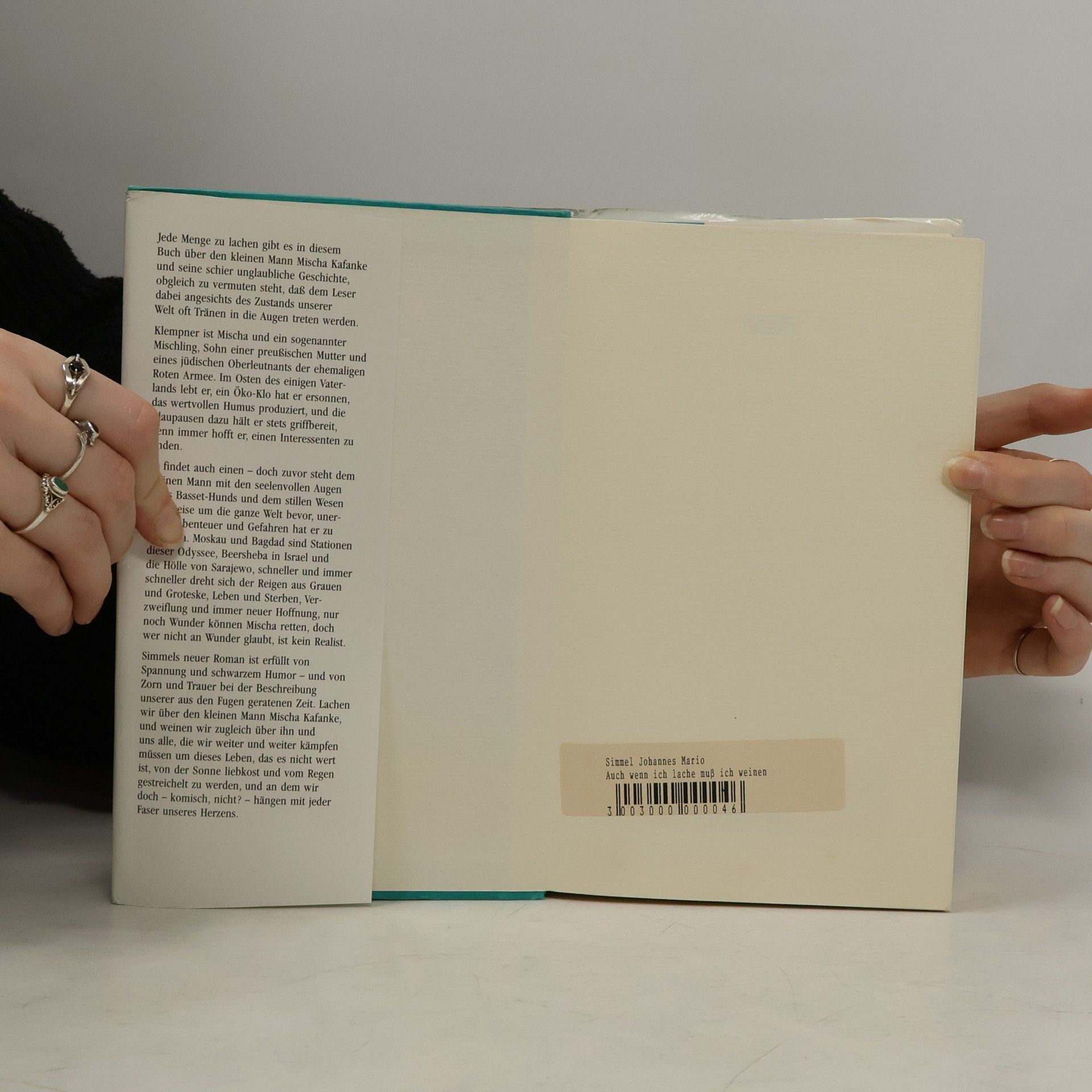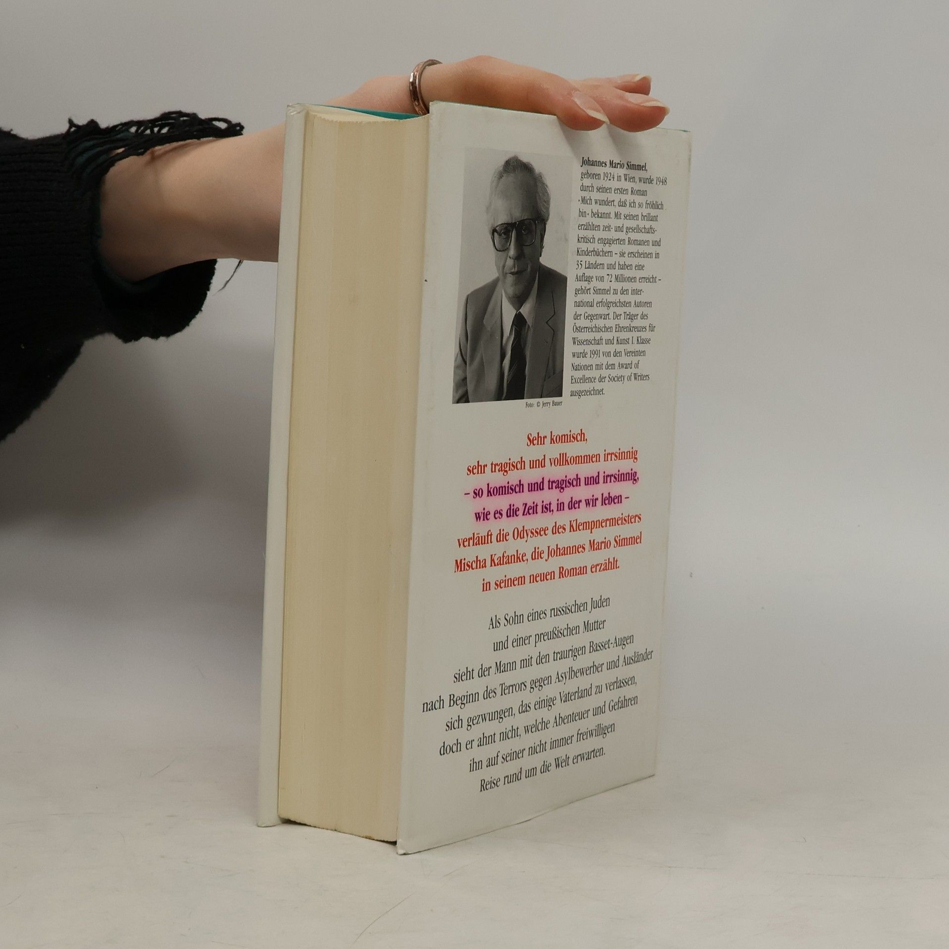 Wieder legt Mario Simmel einen Roman vor, der, was die Aktualität angeht, nichts zu wünschen übrig läßt. Vom Terror gegen Ausländer und Asylbewerber ist die Rede, von Neonazis, die Molotowcocktails schleudern und jüdische Grabstätten schänden. In dieser Atmosphäre glaubt der Klempnermeister Mischa Kafanke als Sohn eines russischen Juden und einer preußischen Mutter nicht mehr leben zu können. Er, der Erfinder eines Öko-Klos, verläßt Deutschland und begibt sich auf eine an Gefahren und Abenteuern reiche Odyssee rund um die Welt.