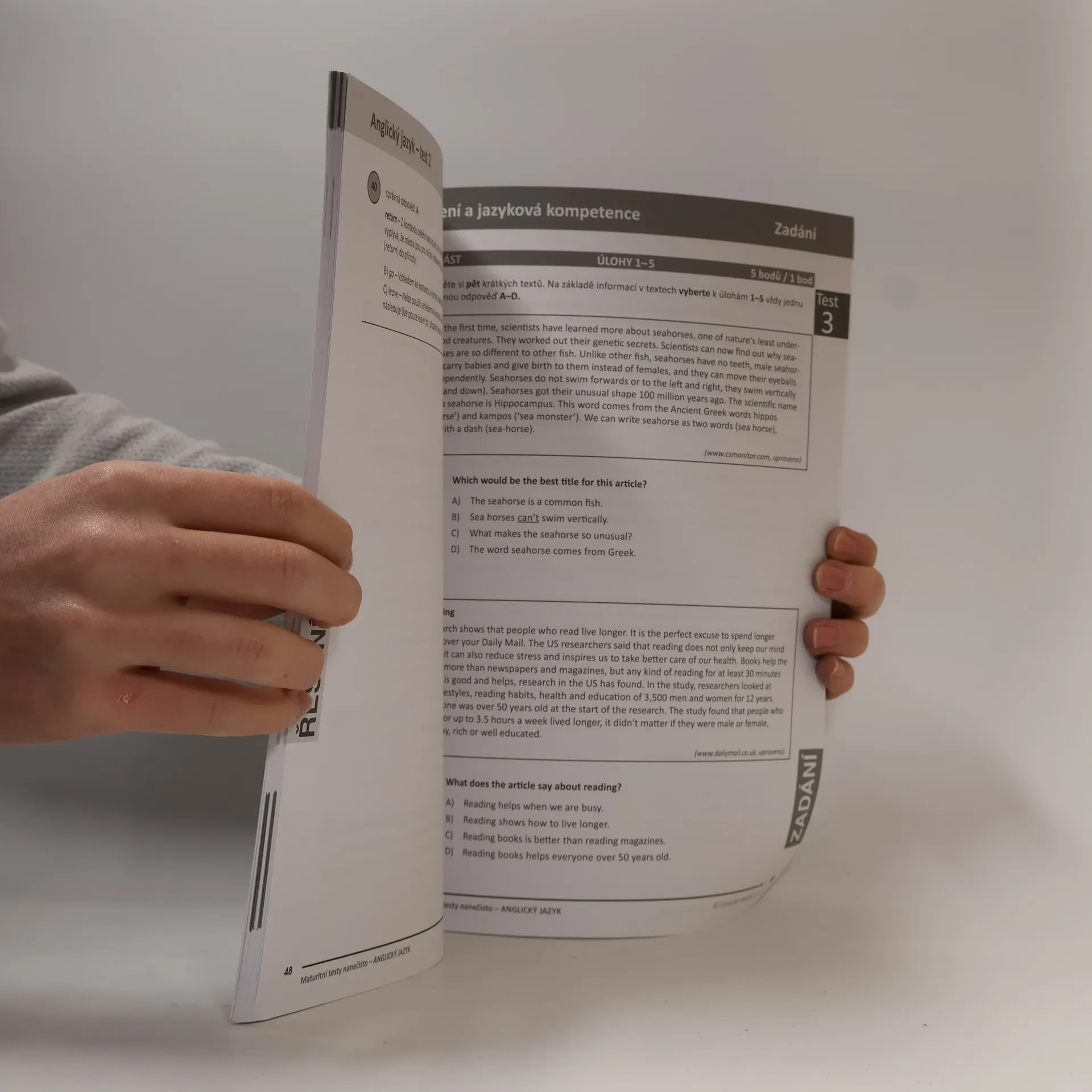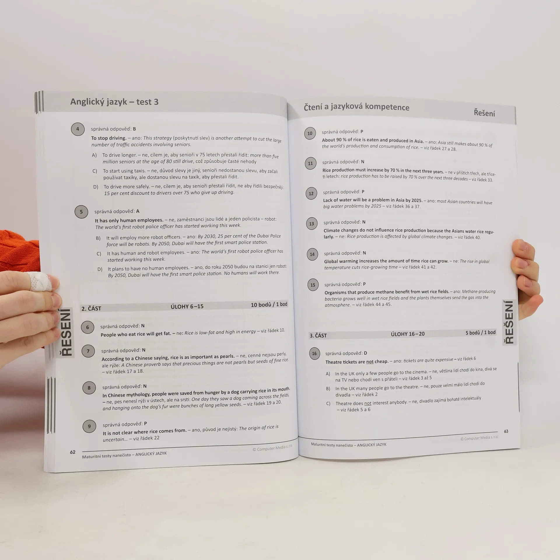 Tato kniha obsahuje soubor pěti testů s řešením a vyhodnocením, které nastiňují reálnou situaci u maturity z anglického jazyka. Předkládané didaktické testy pro čtení a jazykovou kompetenci odpovídají Katalogu požadavků zkoušek společné části maturitní zkoušky pro cizí jazyk, a to jak z hlediska ověřovaných cílů, tak z hlediska typů i charakteristiky výchozích textů, komunikačních situací, oblastí užívání jazyka i tematických okruhů. S přípravným materiálem získáte možnost vyzkoušet si vyřešení pěti různých testů vytvořených podle kritérií CERMATU, zjistit aktuální úroveň svých vědomostí a dovedností, nacvičit si určité postupy a snížit tak míru stresu při řešení didaktických testů při maturitě.