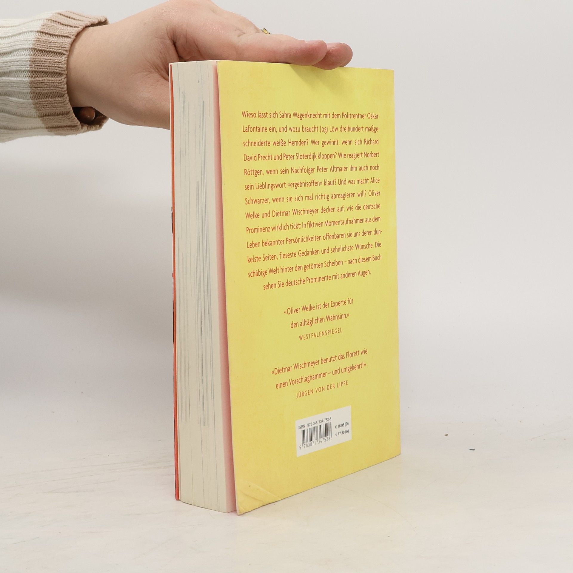 Wieso lässt sich Sahra Wagenknecht mit dem Politrentner Oskar Lafontaine ein, und wozu braucht Jogi Löw dreihundert maßgeschneiderte weiße Hemden? Wer gewinnt, wenn sich Richard David Precht und Peter Sloterdijk kloppen? Wie reagiert Norbert Röttgen, wenn sein Nachfolger Peter Altmaier ihm auch noch sein Lieblingswort «ergebnisoffen» klaut? Und was macht Alice Schwarzer, wenn sie sich mal richtig abreagieren will? Leider werden die Protagonisten immer recht einsilbig, wenn die Homestorys in jene Bereiche vorstoßen, in denen es wirklich interessant wird. Oliver Welke und Dietmar Wischmeyer wagen den Vorstoß in das unbekannte Promi-Land jenseits der autobiographischen Schönfärberei. In ihrem Buch zeigen sie, wie die deutsche Prominenz wirklich tickt, und offenbaren uns mit fiktiven Momentaufnahmen aus dem Leben bekannter Persönlichkeiten deren dunkelste Seiten, fieseste Gedanken und sehnlichste Wünsche. Sie vermitteln tiefere Einblicke in deutsche Politik, Wirtschaft und Kultur, als Presse und Parteipropaganda das vermöchten. Die Wahrheit bricht manchmal dort hervor, wo die Wirklichkeit fiktiv erscheint. Werfen Sie mit Welke und Wischmeyer einen Blick hinter die Fassaden – und erfahren Sie, was unsere Helden vermeintlich unbeobachtet so treiben.